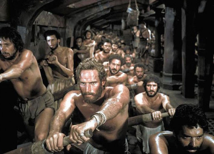 En 1443, un francés llamado Jacques Coeur, armador de galeras, pidió al rey Carlos VII que le dejara tomar por la fuerza a la conocida en aquella época por el nombre de la “chusma”: mendigos, vagabundos u ociosos, para que sirvieran como remeros en las galeras por falta de voluntarios para tal arduo trabajo. Se producía así el nacimiento de una de las peores penas que los condenados han sufrido a lo largo de la historia: la pena a galeras. La pena se imponía por la Comisión de Delitos Denigrantes o por Reincidencia, cuando no podían hacer prever la rehabilitación del condenado (según la teoría de la pena vigente). La legislación de la época establecía que la pena de muerte impuesta por delitos calificados, robos, asaltos en caminos y otros delitos semejantes a éstos, o mayores, o de otro tipo, debían conmutarse por la de galeras por más o menos tiempo, no siendo menor de dos años, atendiendo a las circunstancias de los hechos o a la condición de la persona, pero siempre que los delitos no fuesen tan graves que fuera imprescindible la imposición de la pena de muerte. Los hombres condenados a las galeras fueron denominados galeotes y como norma se asignaban cinco hombres para bogar en cada remo. Esta pena se creó para reforzar la lucha contra los piratas. En la foto, el actor Charlton Heston en una escena de la película Ben Hur (1959). La película es uno de los tres únicos filmes que han conseguido once premios Oscar, junto con “Titanic” y “El señor de los anillos: El retorno del rey”.