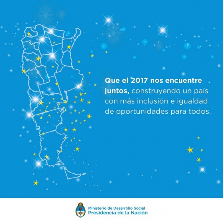 "Que el 2017 nos encuentre unidos y en paz ¡FELIZ AÑO NUEVO!", dice el tuit publicado en la cuenta del ministerio de Desarrollo Social, que va acompañado de una foto en la que no aparecen las Malvinas ni el sector de la Antártida sobre el que la Argentina reclama soberanía. <p lang="pt" dir="ltr">¡FELICIDADES! <a href="https://t.co/AGhBBLXIp0">pic.twitter.com/AGhBBLXIp0</a></p>— Carolina Stanley (@CaroStanley) <a href="https://twitter.com/CaroStanley/status/815192451958931456">31 de diciembre de 2016</a>