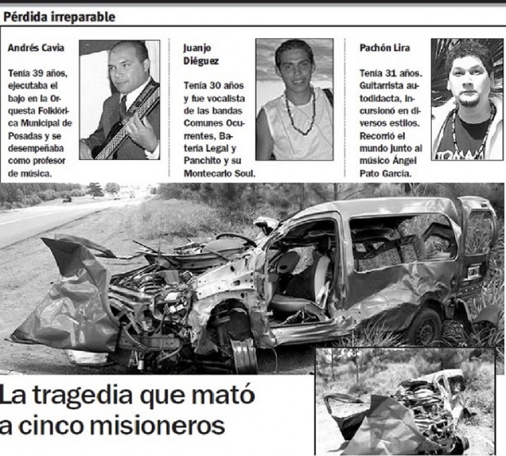 Hace un año la noticia resultaba cruel e increíble, nadie podía comprender tan tremenda pérdida. En la noche del 5 de enero, un fatal accidente en proximidades de Virasoro (Corrientes) se llevaba la vida de los músicos misioneros Pachón Lira, Juanjo Diéguez y Andrés Cavia, del conductor del vehículo, Oscar Félix Meinardo, y de su pareja, Claudia Graciela Marchanka.