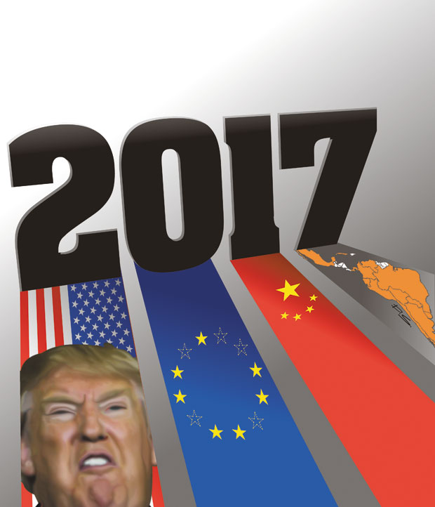 200% del PIB.La estimación es que en 2016 la economía creció un 6,6%, es decir un 0,3% menos que en 2015, y el nivel más bajo de expansión en 25 años.“China puede manejar la situación, pero experimentará una fuerte caída económica que empezará en 2017 y se profundizará en 2018. Pero no descartamos la posibilidad de un aterrizaje forzoso y abrupto”, señala Jakeman del EIU.“En este caso habrá una recesión global porque China es fundamental para todo el planeta”, advierte.Y la evolución de su relación bilateral con Estados Unidos es otro de los grandes enigmas de este 2017.Contrariando la política oficial estadounidense desde el reconocimiento de China en los 70, Trump dialogó telefónicamente con la presidenta de Taiwan, Tsai Ing-Wen, provocando una dura respuesta china que el presidente electo estadounidense contestó con un Twitter desafiante:“¿Acaso nos preguntó China si estaba bien que devaluaran su moneda con lo que afectan la competitividad de nuestras compañías, subir los impuestos en nuestros productos o tener un fuerte complejo militar en el Mar Chino?”, escribió Trump.El llamado telefónico y el Tweet apuntan a un unilateralismo a ultranza estadounidense: no la mejor receta para un escenario internacional moderadamente armónico.¿Y América Latina?A mediados de diciembre la Comisión Económica para América Latina y el Caribe (Cepal) señaló en su último informe de 2016 que “tras dos años seguidos de contracción, América Latina y el Caribe tendrán en 2017 un modesto crecimiento de 1,3%”, es decir, menor al 1,5% calculado previamente.Pero incluso este moderadísimo repunte enfrenta nubarrones, como dijo a BBC Mundo desde Lima, Carlos Bedoya, director de la Red Latinoamericana por la Deuda, Desarrollo y Derechos (Latindadd).“Vemos un aumento de déficit fiscal, debido a los problemas económicos de la región, que se va a financiar con deuda externa”, pronosticó Bedoya.“Durante más de diez años la deuda no nos preocupó, pero con la caída de los precios de las materias primas y el alza de las tasas de interés de la Reserva Federal se va a convertir en un factor de peso”, explicó el economista.“Todavía no es un problema grave de monto, pero sí del porcentaje que habrá que dedicarle en los presupuestos públicos, algo que afectará directamente a los sectores más vulnerables”, le dijo a BBC Mundo.El caso argentino es paradigmático, por la cantidad récord de deuda que tomó el gobierno de Mauricio Macri.Y, en este contexto, el proteccionismo de Trump está produciendo resultados paradójicos.La posible caída del TTP dejaría en el aire a Chile, México y Perú, y le cortó las alas a los gobiernos de Argentina y Brasil que buscaban sumarse a esta iniciativa.“China está aprovechando esta situación. En el congreso de Apec este noviembre en Lima ofreció un tratado de libre comercio a Chile, Mexico y Perú”, explicó Bedoya a BBC Mundo.Una cosa está clara: 2017 será un año muy interesante.Fuente: BBC Mundo