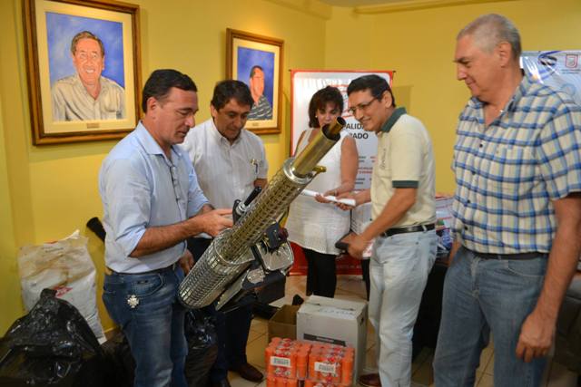 La Municipalidad eldoradense recibió 15 equipos de pantalón y camisa tipo grafa, dos motomochilas, un termoniebla, equipos protectores para bloqueos, guantes de acrilonitrilo, mascarillas,  repelentes e insecticidas (adulticida y larvicida). Acompañaron al titular de salud provincial los subsecretarios de Atención Primaria y Salud Ambiental, Martín Cesino; Salud, Germán Bezus; y de Recurso Humano y Planificación, Rodolfo Fernández Sosa. En representación del intendente Norberto Aguirre, recibió los elementos el secretario de Gobierno, Jorge López, quien estuvo acompañado por la presidenta del Concejo Deliberante, Yolanda Caballero. También estuvieron presentes el director de Zona Norte Paraná de Salud, Jorge Frowein, y el vicepresidente de la comisión de Salud de la Cámara de Diputados, Oscar Alarcón.