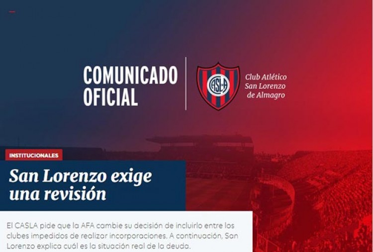 Luego que al Comisión Normalizadora dio a conocer el listado de los clubes que no presentan deudas con la Asociación del Fútbol Argentino y podrán incorporar jugadores en el mercado de pases para la próxima temporada y no figuraba San Lorenzo, el departamento de prensa del club expresó su reclamo en la página oficial de la institución y le solicitó a la AFA que cambie su decisión a través de los siguientes argumentos:"1) Oportunamente, días atrás ha enviado a la Asociación del Fútbol Argentino un plan de pago para saldar la deuda pendiente"."2) El monto de dicha deuda es considerablemente inferior al que la AFA reclama y que ha trascendido: no contempla los varios millones que San Lorenzo aún no recibió en concepto de cuotas impagas por derechos de televisación correspondientes al año 2016"."3) El CASLA ha presentado un pedido formal ante la AFA a fin de conocer cómo se compone la deuda generada hasta el 2012, año en que asumió esta dirigencia, buscando confirmar la validez de la misma"."4) San Lorenzo ha disminuido millonariamente su deuda con la AFA desde el 2012 hasta el día de la fecha, mérito que, curiosamente, no parece ser valorado por la gestión de este Comité de Regularización", reza el mensaje oficial de San Lorenzo".Fuente: Agencia de Noticias NA