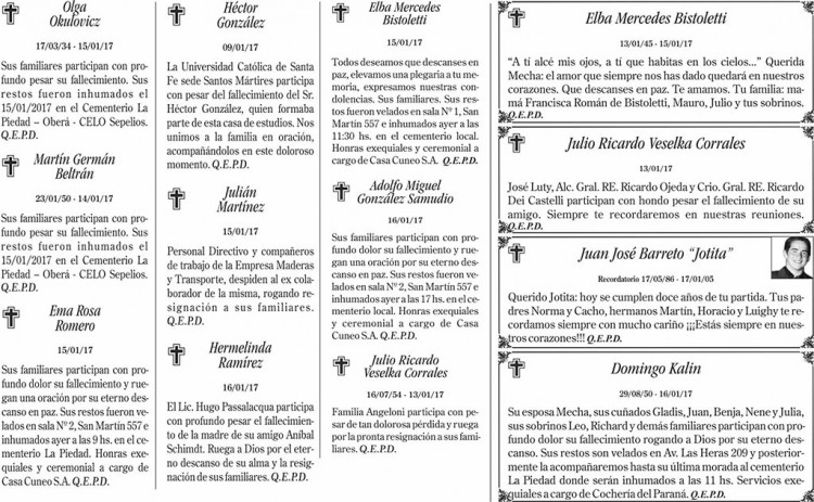 Fúnebres del martes 17 de enero de 2017
