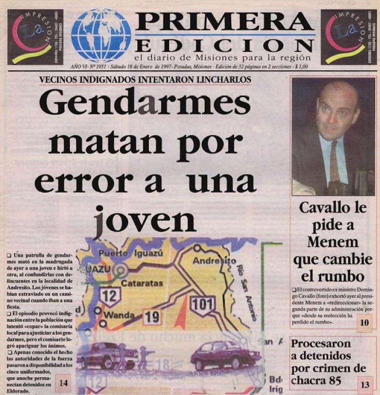 El 17 de enero de 1997, una patrulla de Gendarmería Nacional mataba “por error” a dos jóvenes misioneras en Comandante Andresito, al acribillar a balazos un vehículo en el que viajaban junto a otros dos ocupantes por un camino vecinal.