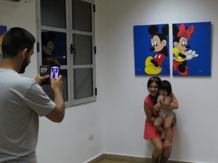 A ellos se suman personajes animados como Pinky y Cerebro, producidos por el reconocido Steven Spielberg, Homero Jay Simpson de la serie de comedia con más  récords mundiales: Más googleada,  mayor cantidad de episodios, más longeva, entre otros y la pareja Mickey – Minnie Mouse;  emblemas  de la compañía Disney que han estado vigente en la infancia de los Baby boomer, Generación X y la desafiante Millenials.Acerca de estos retratos su autora, más conocida en el ámbito de la fotografía, comentó que “entre las artes se entienden así que en la composición de las imágenes creo está presente el adiestramiento del ojo; la pintura es una cuenta pendiente que tenía, nunca la he dejado, solo me he apartado”.Sobre el Espacio Multicultural, se mostró agradecida con la Municipalidad, ya que “es un lugar muy recorrido por muchos turistas y aprovechando esta oportunidad de temporada estival fue  ideal una muestra que sea fácil de seducir a distintas generaciones y que vienen  de distintos lugares”.
