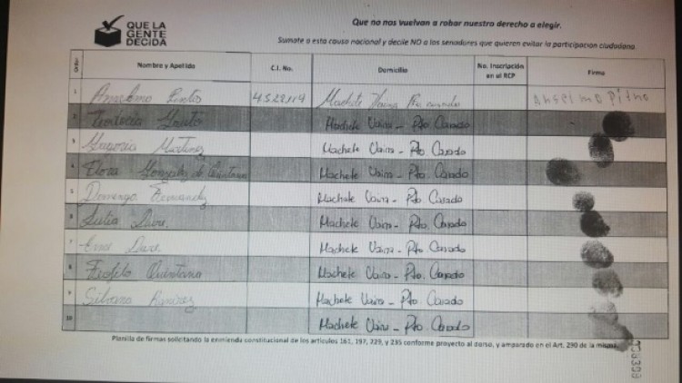 La ANR reconoció que al menos el 20% de las más de 360.000 firmas “recolectadas” no son válidas y ahora se conocen varios casos bochornosos. Y es que uno de los puntos más llamativos tiene que ver con que personas que ya murieron dejaron sus firmas en las planillas.Otra de las anomalías descubiertas fue, por ejemplo, la de una mujer que firmó el documento al menos dos veces. En tanto, algunas de las personas que “apoyan” la iniciativa colorada no llegaron a firmar, sino que dejaron impresas sus huellas dactilares.En otros casos, quienes rubricaron el documento no dejaron constancia de su número de cédula de identidad. Ya más notable fue la planilla con diez nombres y firmas distintas, pero con la exacta misma caligrafía. En este caso el diario Última Hora consultó a una perito calígrafa que confirmó que una misma persona firmó las diez veces.El vicepresidente de la República, Juan Afara, argumentó las falencia de las planillas presentadas por su partido al señalar que “habrá gente entusiasmada que firmó en dos partes”. Aseguró que el Tribunal Superior de Justicia Electoral (TSJE) es la institución que debe constatar si las firmas son válidas. “No se debe desvirtuar el hecho de la presentación de más de 360 mil firmas, las que están mal se sacarán del paquete”, expresó citado por el sitio paraguay.com.Cabe recordar que el Partido Colorado presentó la semana pasada en la justicia las planillas con las firmas de ciudadanos que pretenden llamar a un referéndum para habilitar la posibilidad de reelección del presidente Horacio Cartes, actualmente prohibida por la Constitución.Fuente: Medios Digitales