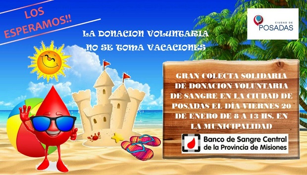 Este viernes 20 de enero estarán de 8 a 14 horas en la Municipalidad de Posadas; el sábado 21 de enero de 8 a 17 horas en la Casa de la Cultura de San Vicente  y el  martes 24 en el Polideportivo de Candelaria de 8 a 14 horas. En tanto que este jueves el equipo de profesionales del Banco de Sangre estuvo realizando colectas en el Hospital de Jardín América.