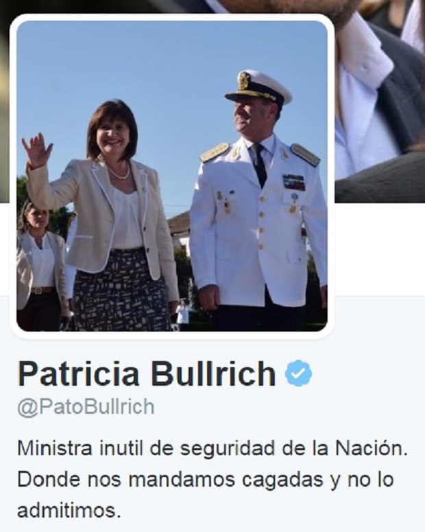 "Hago de manera oficial mi renuncia como ministra de seguridad", apareció sorpresivamente alrededor de las 15:40 de este jueves en la cuenta de Patricia Bullrich en la red social Twitter.Sin embargo, no es un anuncio oficial, sino el primero de una serie de tuits a partir del "hackeo" de la cuenta de la funcionaria perpetrada por manos -obviamente- anónimas pero que se identifican en el mismo timeline como "[S], ema"."Soy una borracha inútil" o "Macri gato" son otros de los posts que comenzaron a aparecer en la cuenta.Horas después, la ministra de Seguridad se refirió a la intromisión, de la cual -dijo- se enteró cuando ingresaba al acto en el que Mauricio Macri le entregó los atributos de mandos a los nuevos jefes de las cuatro fuerzas federales. "Me pueden hackear la cuenta las veces que sea, pero vamos a hacer lo que tenemos que hacer", dijo la funcionario en diálogo con Crónica TV.También explicó que tomarán las acciones que correspondan una vez que encuentren a los responsables del ataque informático.
