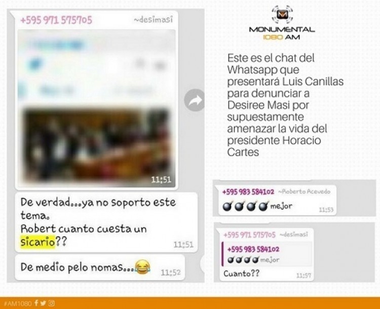 El funcionario acusó a la parlamentaria del Partido Demócrata Progresista (PDP) de proponer la contratación de un “sicario barato” para Cartes. La denuncia se basa en una conversación en un grupo de WhatsApp entre senadores opositores a la reforma o enmienda constitucional que habilite a Cartes a buscar un nuevo mandato.“Hay un plan para echar el país, que todas las propuestas del Ejecutivo vayan al basurero, están hablando de tumbar a Horacio Cartes y al vicepresidente Juan Afara con un juicio político. Quieren trancar y tumbar a HC”, dijo el denunciante citado por la web hoy.com.py. “Yo no sé si fue una broma, pero son parlamentarios y no pueden estar hablando de contratar sicarios”, expresó.Canillas explicó que los senadores cometieron una equivocación e incluyeron en el grupo WhatsApp a una mujer que le hizo llegar la conversación en la que Masi habla de matar al mandatario. “De verdad… ya no soporto este tema. Robert (Acevedo) cuánto cuesta un sicario?? De medio pelo nomás (emoticones de risa)”, fue el mensaje que escribió Masi. A lo que el titular del Congreso Nacional respondió con imágenes de bombas.Masi, de su lado, descartó cualquier intento de magnicidio y lo atribuyó a una broma entre los legisladores que se oponen a la maniobra oficialista. La senadora adelantó que accionará contra el asesor jurídico de la EBY y que pedirá una investigación, aunque aseveró que no espera que la Justicia falle a su favor.