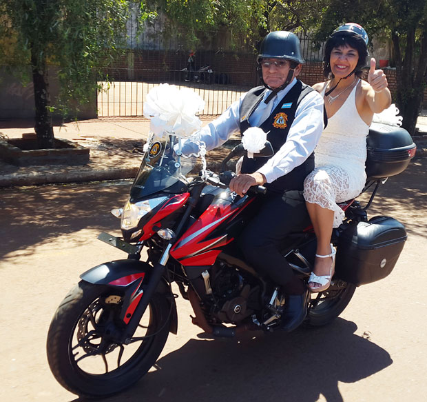 “Le he pedido tanto a Dios, que al final oyó mi voz por la noche a más tardar yendo juntos a la par”,  Pappo, Juntos a la par. Cuando Patricia conoció a Pedro encontró la llave para volver a sentirse más viva. Fue en un viaje, en una ciudad mágica junto a los amigos motoqueros. Esta historia comienza en Oberá, dos años atrás.Ella participaba en casi todos los motoencuentros que se realizaban en la provincia. Esa pasión por los viajes y las motos inició cinco años atrás, gracias a su hijo menor. “Yo era su copiloto y en uno de esos eventos lo vi a Pedro”.El amor los envolvió por completo pero ninguno se animó a decirlo. Todo quedó sellado por  miradas en un encuentro que no tendría final. Pasó más de un año para que se volvieran a ver. Fue en un motoasado en el camping de la Asociación de Empleados de Comercio de Oberá (Aeco). Él se le acercó y la saludó. Las horas no alcanzaron para contarse la vida. Ella de 51 años y él, algunos años más. Patricia nacida en Buenos Aires pero desde hace 18 años vive en Oberá, con sus tres hijos. Pedro, fanático de las motos desde muy joven, viajó por casi toda la Argentina. Es de Santo Tomé, Corrientes donde reside junto a sus dos hijas. “A nosotros nos une el amor por el motociclismo, viajar… la ruta”, dijo ella.Cuando se fue, grabó en su memoria esas horas maravillosas: sus manos en las de ella, su cara, la sonrisa. Intentó no olvidar ningún detalle. Los dos entendieron que se tenían que volver a ver pero esta vez no tardarían tanto. Un día tocaron el timbre. Cuando Patricia abrió la puerta creyó que estaba soñando. Ante sus ojos Pedro, la miraba con una sonrisa que se le escapaba de la cara, había viajado los 200 kilómetros que separan Santo Tomé de la ciudad que brilla. “Me invitó a recorrer los Saltos del Moconá en motocicleta. Desde ese día comenzamos a viajar juntos. Ese fue nuestro inicio”, recuerda Patricia.Recorrían 200 kilómetros para verse y otros 200 de regreso. “Algunos decían que no duraríamos por la distancia, pero si uno deposita los sueños en manos de Dios él sabrá guiarnos”. Después de dos años, Pedro le propuso matrimonio y ni bien Patricia dio el “sí” los motoqueros comenzaron a planificar el “motocasamiento”.La boda convocó a más de 130 invitados en el camping Aeco de Oberá. Allí donde hablaron por primera vez.A la celebración llegaron motociclistas de Posadas, Aristóbulo del Valle, Apóstoles, Chaco, Corrientes, Buenos Aires, entre otros puntos. Incluso de otros países como Paraguay y Uruguay. Los novios salieron rumbo al altar en una motocicleta acompañada por otras que formaron una caravana de bocinazos y sirenas a la voz de “viva los novios”. Y así, frente a la familia y los amigos Patricia Dacurso y Pedro Martínez se unieron ante Dios.  PorSusana Breska [email protected]