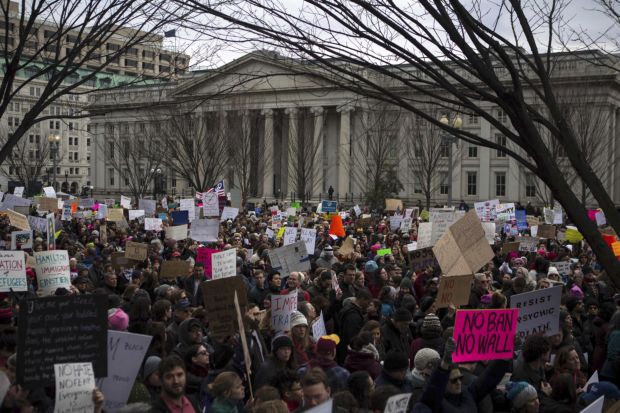 En los accesos a la Casa Blanca resonaban el domingo consignas y cánticos de varios miles de manifestantes en apoyo a los ciudadanos de países musulmanes impedidos de ingresar a Estados Unidos por un decreto del presidente Donald Trump."El amor, no el miedo, es lo que da grandeza a Estados Unidos", repetía a coro una muchedumbre ubicada a buena distancia de la residencia presidencial, separada por altas vayas de alambre que cercan la avenida Pennsylvania."Este decreto está en verdad contra nuestros principios fundacionales y lo que dice la Constitución", dice Jeff Lockwood, un padre de familia de 44 años, rodeado de numerosos carteles en los que se podía leer "Los inmigrantes son Estados Unidos" o "¡Déjenles entrar!".También podían verse algunos gorros color rosa, símbolo de la marcha de las mujeres que reunió a millones de personas en Washington la semana pasada.Trump "dice que esto no es antimusulmán, pero es muy antimusulmán, sobre todo cuando dice que va a cuidar a los cristianos" en los países árabes, dijo indignada Khadija Shakour, una musulmana estadounidense que portaba un velo en la cabeza y un cartel que decía "No a la exclusión religiosa".Los numerosos manifestantes, que también enarbolaban reproducciones de la estatua de la libertad y banderas de los Estados Unidos, están convencidos de que el decreto que suspende el ingreso de ciudadanos de siete países musulmanes (Siria, Libia, Irán, Iraq, Sudán, Yemen y Somalia) y de los refugiados burla los valores estadounidenses.Fuente y Fotos: NA