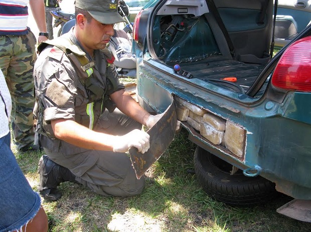 Gendarmería Nacional secuestró el pasado fin de semana 112,192 kilogramos de marihuana que eran transportados en diferentes compartimientos de un rodado que circulaba en jurisdicción de la localidad correntina de Ituzaingó. A la altura del kilómetro 1.232 de la ruta nacional 12, los gendarmes detuvieron la marcha de un vehículo Peugeot 206 en el que viajaban un hombre y una mujer de nacionalidad paraguaya. Al momento de efectuar la inspección, detectaron que el interior del baúl presentaba ciertas anomalías. Ante tal situación, y con la ayuda del can antinarcóticos Rafael, se efectuó una requisa sobre el mencionado sector.El animal reaccionó como lo hace habitualmente ante la presencia de estupefacientes, corroborando las sospechas de los efectivos. Ante la presencia de testigos, los uniformados constataron en el piso del baúl (en un doble fondo), debajo de los asientos traseros y en el panel del guardabarros del sector del acompañante, 162 "ladrillos" de marihuana. Un peso total de 112 kilos 192 gramos, que fueron incautados. Intervino en la causa el Juzgado Federal N°2 de Corrientes, que orientó la incautación de la droga y del vehículo, así como la detención de los dos involucrados. Fotos: Prensa GN