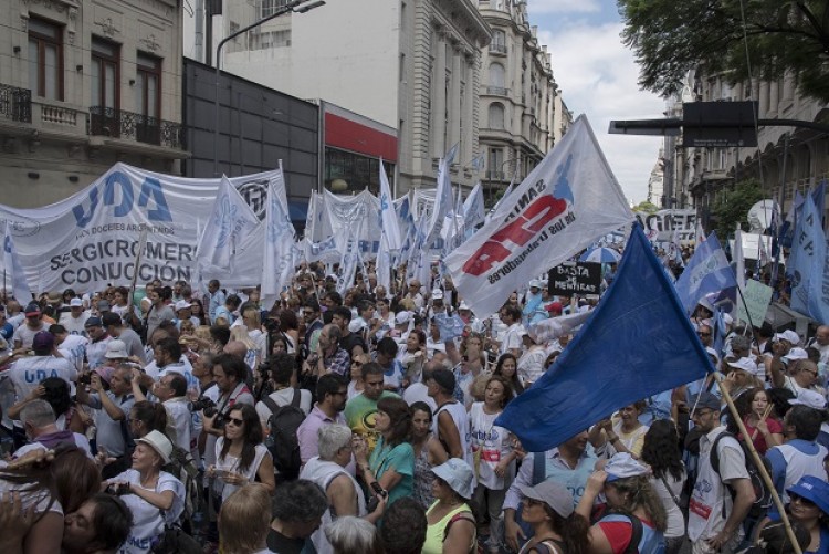 Docentes y dirigentes sindicales de varias provincias marcharon hoy por la zona de Congreso para rechazar el "techo" salarial que intentarán acordar los gobernadores ante la falta de una paritaria nacional de referencia. Los docentes marcharon desde la esquina del Congreso hasta Callao 181, dado que allí se encuentra el hotel en el que se iban a reunir los mandatarios provinciales que a último momento cambiaron la sede de su encuentro. Federico Puy, congresal de UTE-CTERA y dirigente de la Corriente Nacional 9 de Abril-Lista Marrón, dijo a NA que la marcha fue realizada con una protesta frente a la Casa de la Provincia de Buenos Aires. Trabajadores de la educación agrupados en los gremios Ademys y UTE (CABA) y en Suteba (Buenos Aires) se movilizaron junto a dirigentes sindicales de otras jurisdicciones para denunciar "este intento de ataque al salario".Puy agregó que que el "techo salarial" será parte de un pacto entre Cambiemos y la oposición en año electoral. Fuente: NA