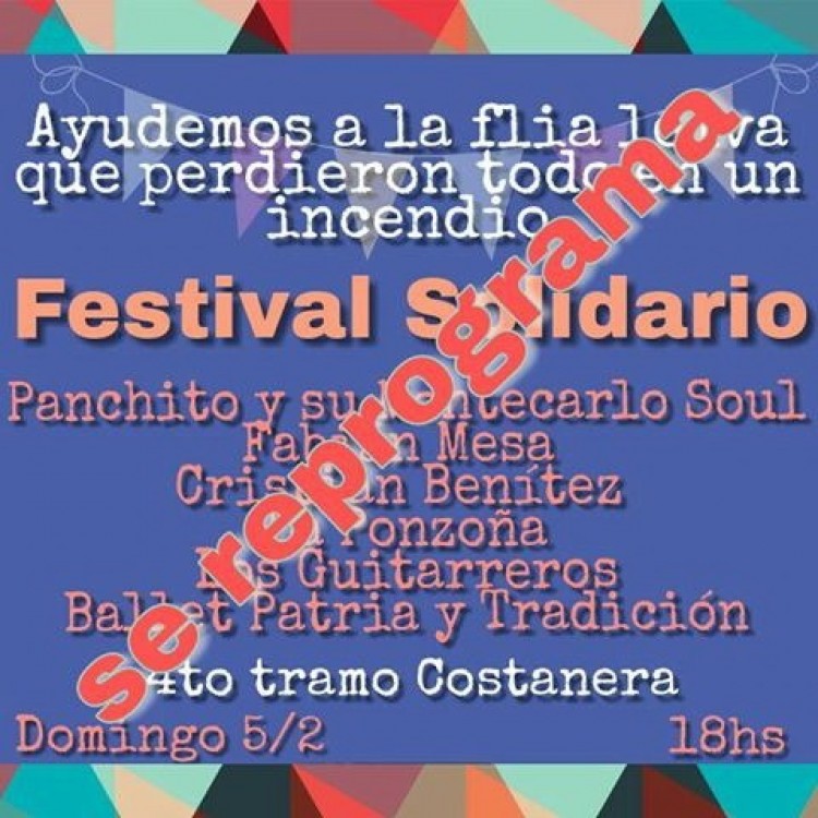 El Festival solidario debía realizarse este domingo a partir de las 18 en el cuarto tramo de la costanera, pero se suspendió debido a las lluvias caídas en las últimas horas en la región y se trasladará al domingo 12 en el mismo lugar y horario.El encuentro se iba a realizar para juntar elementos para ayudar al trombonista Sergio Leiva y su familia, quienes perdieron todas sus pertenencias en el incendio de su vivienda que ocurrió el jueves.Igualmente, las líneas de donaciones siguen abiertas para quienes quieran colaborar con la familia damnificada pueden contactarse a los teléfonos de: Diego Caballero 0364691580 o Sergio Leiva, 03764248809.Los números previstos para esa oportunidad son: La Montecarlo Soul, Fabián Mesa, Cristian Benítez, La Guitarreada y El Ballet Patria y Tradición. Además de contar con la participación de FAB (Feria Abierta del Bosetti) y la Municipalidad de Posadas.