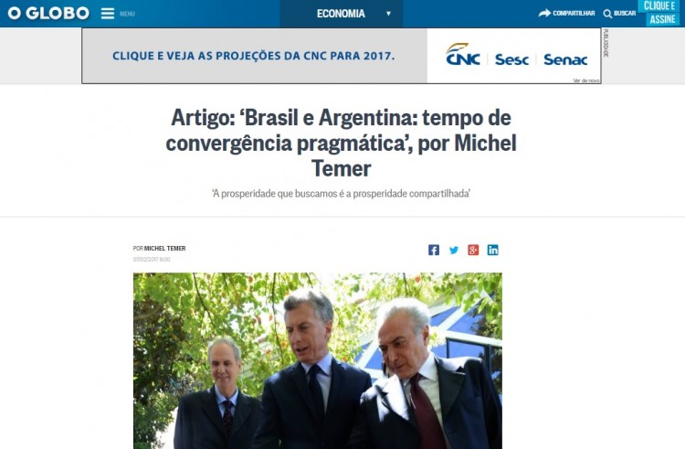 Lo hizo en una columna publicada este martes en el diario O Globo antes de recibir la visita de Estado de Macri.En una referencia al escenario global supuestamente vinculado a las políticas de Donald Trump en Estados Unidos, a quien no nombra, Temer afirmó: "Nuestra unión es cada vez más necesaria en un mundo que delante de la incertidumbre cede a las influencias contra la integración".Amplió con que "frente a los nacionalismos exacerbados y crecientes presiones proteccionistas, tenemos que aproximarnos cada vez más. Nuestra respuesta a las tendencias aislacionistas deben ser más integración".Frente a la agenda de trabajo con Macri, Temer destacó que en el tercer encuentro en seis meses ambos presentes abogarán por "relaciones entre los dos países al servicio no de concepciones dogmáticas sino de valores e intereses de argentinos y brasileños".Temer también habló de la necesidad de "medidas concretas" para "recuperar el tiempo perdido" y "los canales bilaterales que habían sido congelados"."En los últimos tres meses hubo un significativo aumento de las importaciones de productos argentinos en Brasil, una señal importante de que se ha retomado el dinamismo económico", dice la columna del jefe del Estado brasileño que también reproduce el matutino Clarín en la Argentina.Frente al Mercosur, Temer dijo que "es tiempo de recuperar el camino del trabajo de la integración efectiva, ya que la dispersión de esfuerzos legó un saldo modesto de realizaciones".