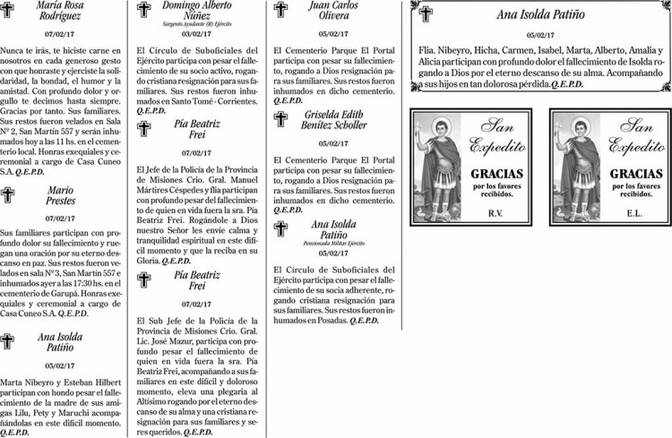 Fúnebres del miércoles 8 de febrero de 2017