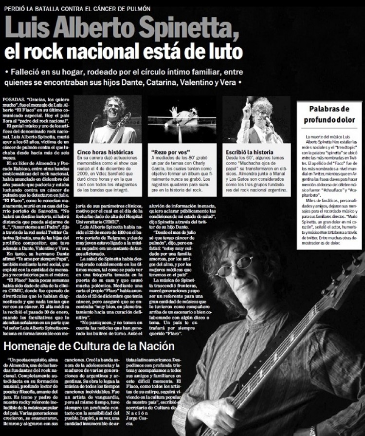 ; la fábula de “Las aventuras de la abeja reina”; la despojada “Casas marcadas” y la zamba “Barro tal vez”, escrita a los 15 años.“MADRE EN AÑOS LUZ” (1984)En el último de los cuatro discos grabados con la cambiante formación Spinetta Jade, el Flaco hace sus primeros experimentos digitales con baterías programadas, un nuevo motivo para que sus fans más intransigentes expresaran críticas. Obviamente, Spinetta iba a responder dos años después con “Privé”, un disco aún más radical desde el punto de vista tecnológico. Aunque todavía persistían en su música los elementos del jazz-rock, aderezados con sonidos más pop, el artista intenta hacer su lectura de los nuevos sonidos que inundaban al rock de la época. “Camafeo”, “Entonces es como dar amor”, “Ludmila”, “Enero del último día” y “Diganlé” son algunas de las canciones que mejor conjugan al Spinetta insertado en la “primavera alfonsinista”. “PELUSÓN OF MILK” (1991)Acústico, reflexivo y también críptico en varios pasajes, la inminente llegada de su cuarta hija Vera impulsó a Spinetta a grabar un disco que pareciera una larga canción de cuna, con algunos matices. Ya había quedado atrás el proyecto frustrado de un disco conjunto con Charly García, la realización de un álbum con Fito Páez, el sorpresivo éxito de "Téster de Violencia" y el hermético "Don Lucero". En ese contexto, Spinetta saca a relucir su costado más “amable” y hasta se permite una concesión con “Seguir viviendo sin tu amor”, tal vez su mayor hit radial. Pero esta postura duraría muy poco, debido a que al año siguiente decidió llamarse a silencio por un tiempo prolongado, como reacción a su enojo con la industria.“SPINETTA Y LOS SOCIOS DEL DESIERTO” (1997)El regreso a la vida pública, de la mano del incendiario power trío conformado por Marcelo Torres y Daniel Wirtz, no fue precisamente un bálsamo para Spinetta. Con un trabajo que comenzó a gestarse en 1994, un largo tironeo con las discográficas aplazó el lanzamiento de un trabajo doble que, mientras tanto, fue mostrado en varias presentaciones en vivo. En tiempos en donde la música pasaba por MTV, y el grunge y la “movida sónica” copaban las radios, el Flaco apostó por su costado más garagero, lo que en su caso implicaría no dejar de lado sutilezas y pasajes de ensoñación. “Cheques” y “Bosnia” o “Nasty people” y “La orilla infinita” aparecen como los extremos más marcados en esta dualidad.“PAN” (2005)Maduro, sin necesidad de tener que demostrar estar a tono con los nuevos tiempos, pero profundo como de costumbre, este disco resulta la mejor muestra del Spinetta modelo 2000, capaz de seguir escarbando en los lugares más recónditos del alma humana. Su relajada postura en esta etapa le permitió también lanzar algunos guiños al pasado, tal como lo hace en “Sinfín”, en donde hace alusión a “Para ir”, un viejo tema de Almendra. “Cabecita calesita”, “Espuma mística” y “Dale luz al instante” destacan en un placentero trabajo en donde, a pesar del tono amigable, Spinetta se las ingenia para poner sobre las mesa los elementos que muchas veces hicieron que su obra no fuera fácil de abordar. Los mismos que lo convirtieron en un artista único.Fuente: Télam