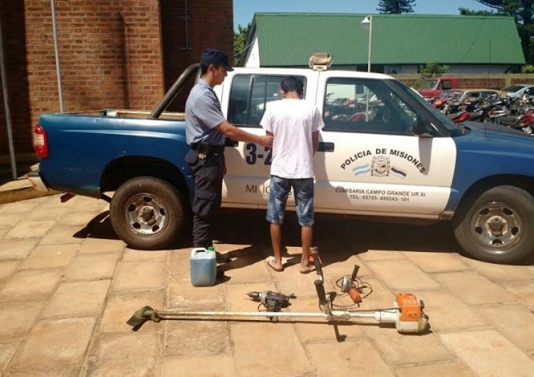 Alrededor de las 15:00 de este miércoles, en una vivienda ubicada en el kilómetro 915 de la ruta nacional 14, la Policía de Campo Grande procedió al secuestro de una amoladora, una motoguadaña, un taladro y un bidón con combustible. Los elementos habían sido sustraídos en las últimas horas de un secadero propiedad de José Z. (43) ubicado en el kilómetro 914 de la misma arteria nacional. Por el hecho fue detenido el sereno del lugar identificado como Marcelo G. (30). El detenido fue alojado en la comisaría local, donde se instruyen las actuaciones de rigor.