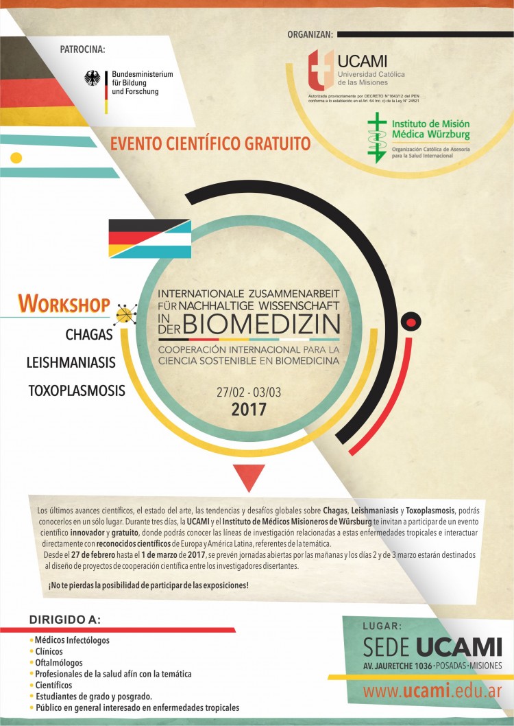 En la sede de la Universidad Católica de las Misiones, entre el 27 de febrero y el 3 de marzo de 2017, tendrá lugar el Workshop Internacional que bajo el título "Cooperación Internacional para la Ciencia sostenible en Biomedicina", abordará tres enfermedades de interés global: Chagas, Leishmaniasis y Toxoplasmosis. Esta actividad se desarrollará entre el 27 de febrero y el 3 de marzo de 2017 en el Campus Monseñor Jorge Kemerer, sede de la Universidad Católica de las Misiones, ubicado en avenida Jauretche 1.036 de Posadas. El Workshop está dirigido a médicos infectólogos, clínicos, oftalmólogos, profesionales de la salud afín con la temática, científicos, estudiantes de grado y posgrado y público en general interesado en enfermedades tropicales.La inscripción online puede realizarse ingresando <a href="http://ucami.edu.ar/workshop2017/">al link del workshop</a> y en <a href="http://www.ucami.edu.ar/">la página web de la Universidad</a> se podrá acceder a más información.