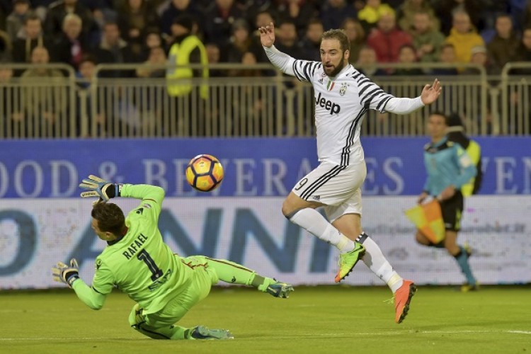 Gonzalo Higuaín anotó los tantos bianconeros a los 37 minutos del primer tiempo y a los 2 del complemento.Para la Roma, que venció por idéntico marcador en cancha del Crotone, marcaron Nainggolan (40) y Dzeko (77), que había errado un penal en el primer tramo del partido.A falta de 14 fechas para el final de la Serie A, Juventus suma 60 puntos por 53 del equipo de la capital italiana.