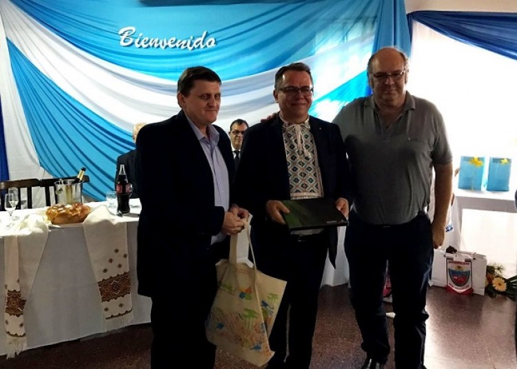 El Embajador Ucraniano en Argentina, Yurii Diudin, se encuentra de visita en la región a fin de analizar futuros acuerdos de cooperación con Misiones y Corrientes. El domingo participó de un almuerzo de camaradería que se desarrolló en el Club Cooperativista de Colonia Liebig, donde el ministro de Industria de Misiones, Luis Lichowski y su par de Hacienda, Adolfo Safrán, le entregaron información económica y turística de la tierra colorada. Del encuentro también participó Sebastián Oriozabala, subsecretario de Planificación, Extensión y Programas de Financiamiento Rural del Ministerio del Agro y la Producción, en representación de ministro Luis Garay. Diudin estuvo acompañado por el presidente de la Cámara Argentino-Ucraniana de Comercio e Industria, Fernando Sfeir, y el Director Ejecutivo de la misma entidad, Oleh Jachno. Además la reunión contó con la participación de autoridades de la provincia de Corrientes, intendentes de localidades misioneras e integrantes de la Comunidad Ucraniana de la Zona Sur. Durante la jornada del lunes se desarrollaron reuniones de trabajo con el embajador, autoridades de Corrientes y Misiones, con el objetivo de evaluar posibles acuerdos de cooperación entre Ucrania y las mencionadas provincias. El músico Rubén “Rulo” Grabovieski y el Ballet Ucraniano Vesná de Apóstoles fueron los encargados de recibir a Diudin. Brindaron un espectáculo con danzas tradicionales y previamente se realizó la tradicional bienvenida con la ceremonia del pan y la sal.