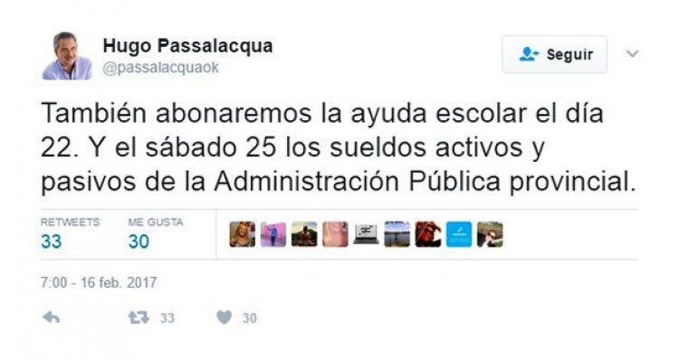 "El miércoles 22 abonaremos, adelantado con recursos provinciales, el Fonid y la Garantía Salarial Mínima de Diciembre. Además, se pagarán Art.9 y las suplementarias de Diciembre y Enero", precisó el gobernador Hugo Passalacqua, a través de la red social Twitter.Además anunció el pago de la ayuda escolar para el mismo día 22, y los haberes estatales para el sábado 25 de febrero. "También abonaremos la ayuda escolar el día 22. Y el sábado 25 los sueldos activos y pasivos de la Administración Pública provincial".Los conceptos detallados estarán depositados por la Provincia según el cronograma previsto y anunciado, aunque sujeto a la disponibilidad en caso de producirse medidas de fuerza en el sector bancario. En tal sentido, el gobernador hizo referencia a esa eventualidad. "Los fondos estarán disponibles en los cajeros automáticos según lo anunciado, salvo alguna dificultad derivada de paro bancario, situación que excede al ámbito provincial", remarcó. <p lang="es" dir="ltr">Atención al siguiente CRONOGRAMA: El miércoles 22 abonaremos, adelantado con recursos prov., el Fonid y la Garantía Salarial Mínima de Dic/.</p>— Hugo Passalacqua (@passalacquaok) <a href="https://twitter.com/passalacquaok/status/832167021911609344">16 de febrero de 2017</a>