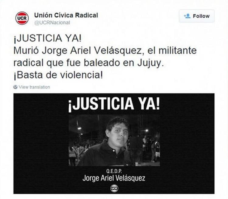 El candidato a gobernador por Jujuy Gerardo Morales pidió este jueves al gobierno nacional "no desviar" ni "garantizar impunidad" por el crimen del militante radical Jorge Ariel Velázquez.   Morales también cuestionó "irregularidades" en el proceso de investigación y apuntó a "organizaciones violentas" tras vincular el crimen con la agrupación Tupac Amaru de Milagro Sala.   En declaraciones a radio Continental y Vorterix, el dirigente solicitó "que se pongan las pilas en el gobierno y no busquen desviar y garantizar la impunidad como hacen permanentemente acá en Jujuy con organizaciones violentas".   La causa, que en un primer momento se caratuló como un intento de robo, tuvo un "giro" luego de que un "testigo oculto" se presentara a declarar el miércoles, tras la muerte del joven de 22 años, y vinculara al homicidio con una "equivocación" de identidad, reveló Morales aunque aclaró que se trataba de información "informal".     Velázquez fue baleado por la espalda el sábado 8 de agosto, un día antes de las Paso, cuando ingresaba a su casa del barrio Juan Pablo II de la ciudad de San Pedro en Jujuy, 60 kilómetros al sur de San Salvador, luego de realizar tareas proselitistas.  Morales se mostró conmovido por el fallecimiento del joven por el que resolvió suspender el acto de lanzamiento de su candidatura, que estaba previsto para el miércoles.   Y volvió a vincular con el hecho a la agrupación Tupac Amaru al recordar que en la tarde del viernes pasado el joven mantuvo un "cruce con militantes" de esa organización en el barrio La Merced, donde Velázquez repartía boletas electorales, aunque dijo: "No estamos en condiciones de acusar ni culpar a nadie. Describimos una serie de hechos que nos preocupan".     "Hemos denunciado un clima creciente de violencia política. Hace más de un mes hemos puesto en conocimiento (al ministro de Justicia) Julio Alak, al juez y luego, el sábado 8 de agosto después del balazo que recibe Ariel", sostuvo Morales.   Asimismo, cuestionó la labor de la fiscal que interviene en el caso porque "sin haber tomado una sola declaración" planteó el tema "como un hecho de intento de robo de un celular", pese a que al  joven no le faltaban pertenencias.   "Presuroso el gobierno y la fiscal han activado mecanismos que han orientado la causa primero en un sentido, ahora en otro. A nosotros nos llama mucho la atención la irregularidad en el manejo de esta situación", sospechó.     En este sentido, repudió enfáticamente "la violencia de  cualquier signo: sea violencia política, que es nuestra sospecha, o un delito de inseguridad".   Por eso, reclamó "a la justicia, al fiscal y al juez justicia y verdad por el homicidio o crimen de Ariel Velázquez".   "Espero que el jefe de gabinete, el gobierno, hagan lo que tienen que hacer", reclamó el radical al advertir "un clima de violencia que no da garantías el gobierno ni la justicia de que se pueda desarrollar la actividad política con tranquilidad".Fuente: agencia DyN