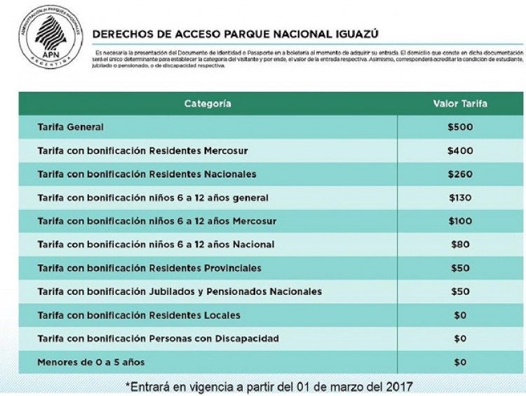 El incremento fue autorizado por Resolución N°310 del Consejo de Administración de Parques Nacionales. La entrada general costará 500 pesos, mientras que los residentes en el Mercosur pagarán $400 frente a los $250 que abonaban hasta ahora.La tarifa para argentinos pasa de los 200 pesos actuales a $260 a partir de este miércoles, aunque específicamente los residentes en Argentina sólo pagarán $50, 10 pesos más que hasta ahora.Otros precios bonificados son los de niños de 12 años en general (la tarifa pasa de 80 a 130 pesos); niños argentinos de 6 a 12 años (de 50 a 80 pesos); y jubilados y pensionados nacionales (de $40 pasa a 50 pesos).Se mantiene vigente la gratuidad del ingreso para residentes en Iguazú, personas con discapacidad y niños menores de 5 años.Fuente: <a href="http://www.lavozdecataratas.com/">La Voz de Cataratas</a>