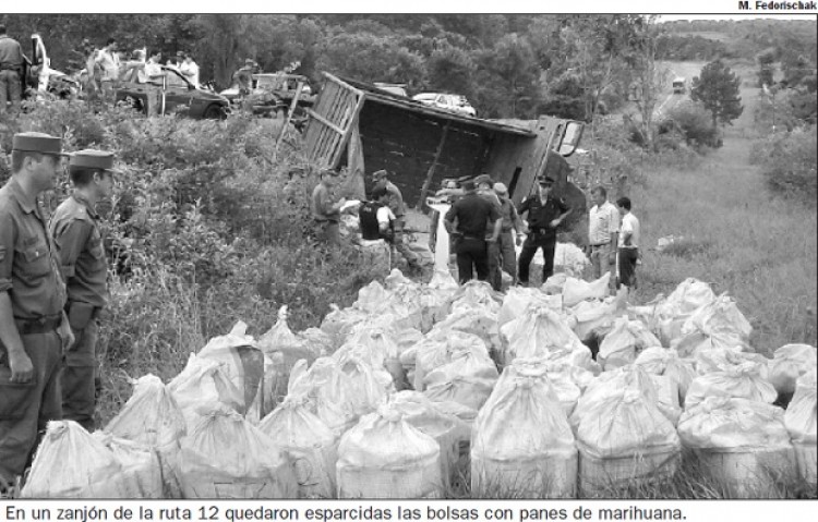 (Nota completa publicada por PRIMERA EDICIÓN el 1 de marzo de 2007)La lucha contra el tráfico de drogas en Misiones arrojó importantes resultados este mes y ayer nuevamente las fuerzas federales propinaron un fuerte golpe a los financistas de la marihuana, al decomisar poco más de 4 toneladas de esta sustancia y detener al hombre que las transportaba.Esta vez el operativo tuvo como circunstancia especial la persecución de un viejo camión que finalmente volcó a un costado de la ruta 12, en inmediaciones del acceso a las ruinas de Santa Ana.El jefe de la Delegación Posadas de la Policía Federal Argentina, comisario Hugo Ottobre, comentó que “en horas de la madrugada recibimos una llamada telefónica de una persona que daba cuenta de los movimientos sospechosos de un camión y dos automóviles en una estación de servicios sobre la ruta 12, por lo que enviamos hacia allá un grupo de hombres de civil”.Según Ottobre, los policías montaron una discreta vigilancia y observaron el desplazamiento por la carretera, de dos vehículos que posiblemente “despejaban el camino”. Y minutos después cruzó el camión, un viejo Mercedez Benz de color rojo, sin patente colocada, “pocas luces” y con carrocería de madera.“En ese momento se colocó la baliza al móvil y se inició la persecución desde el peaje hacia Santa Ana, solicitándole a los ocupantes que se detengan. Pero el camión realiza maniobras evasivas, pasándose de carril, luego se oyeron dos detonaciones, por lo que el personal efectúa disparos a los neumáticos y ésto provoca el vuelco del transporte en una zanja, desparramando gran cantidad de bultos”, acotó.Uno de los ocupantes del camión logró darse a la fuga, mientras que el otro se entregó. “En ese momento también aparece personal de Gendarmería que manifiesta estar detrás del camión”, concluyó Ottobre.Rutas alternativasEn tanto, desde el Escuadrón 11 San Ignacio de Gendarmería se informó que desde diciembre último se estaba trabajando en la hipótesis de rutas alternativas utilizadas por los narcotraficantes para tratar de eludir los controles. En este sentido acotaron que se intensificaron las vigilancias en torno a caminos de tierra entre Santa Ana, Candelaria, Cerro Corá y Bompland. Y que posiblemente este camión -que no fue registrado por las cámaras de la estación de peaje- se dirigía hacia algún camino de tierra para descargar las bolsas de tierra en algún centro de acopio. Desde allí partiría luego en algún otro medio de transporte hacia otros puntos del país.Con lo decomisado ayer, suman poco más de 15 toneladas de marihuana decomisada en menos de un mes en Misiones y Entre Ríos, por fuerzas federales.