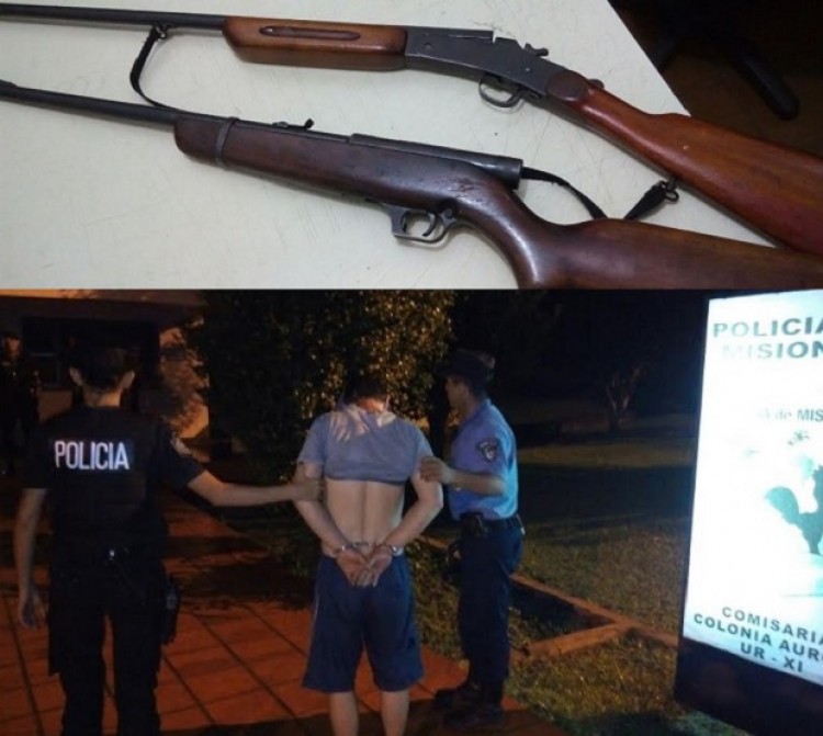Alrededor de la 1:10 de este domingo, una mujer de 29 años solicito presencia policial en su vivienda debido a que su pareja, identificada como Rudi K., la había agredido y amenazado con un arma de fuego. Inmediatamente, una comisión policial compuesta por personal de la comisaría local y de la División Comando Radioeléctrico de Santa Rita se constituyeron en el lugar, procediendo a la detención del individuo de 34 años y al secuestro de una escopeta calibre 32 y un rifle calibre 22, ambos sin municiones. El detenido fue alojado en sede policial, a disposición de la Justicia Penal de Oberá, en tanto que la víctima fue examinada por el médico de turno del hospital de Colonia Aurora, quien diagnosticó "contusiones en el tórax".