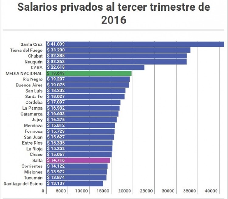 El empleo en negro se mantiene cerca del 40% hace muchos años en Misiones. Los empleadores que pagan de esta manera, ilegal, evaden aportes patronales y previsionales, además de pagar sueldos inferiores a los que corresponden por cada actividad. Este alto grado de empleo en negro podría ser uno de los motivos del bajo salario “en blanco” que tienen los asalariados privados. El empleado formal prefiere mantener un salario bajo “en blanco”, antes que engrosar la fila de los informales donde las condiciones son mucho peores.Esta situación fue corroborada por un informe reciente que muestra lo desvalorizado que sigue estando el salario del trabajador del sector privado en Misiones. La remuneración bruta promedio en la provincia en el tercer trimestre del año pasado fue de $ 13.972, esto la ubicó entre las tres jurisdicciones que menos paga en el país.En relación a la media nacional ($19.649), el empleado de una empresa privada en Misiones cobró casi $6.000 pesos menos cada mes. Y en comparación al promedio de sueldo más alto que se registró en el país, el de Santa Cruz ($41.099), el salario misionero promedio estuvo cerca de $27.000 por debajo, según el último informe realizado por la consultora Economía y Regiones en base a los datos del Instituto Nacional de Estadísticas y Censos (Indec).Quiere decir que el salario promedio privado de un misionero es tres veces menos que el salario de un santacruceño. Ahí se entiende la migración de misioneros que concurre a buscar trabajo y probar suerte en las provincias del Sur.“De acuerdo a las cifras suministradas por el Indec sobre la base de la información provista por el Sistema Integrado Previsional Argentino (SIPA), la remuneración bruta promedio mensual del sector privado registrado al tercer trimestre de 2016 ascendió a $19.649, evidenciando un incremento del 32,5% respecto al mismo trimestre de 2015”, dice el informe.Asimismo, el estudio da cuenta que la “remuneración neta” alcanzó a $16.889 creciendo un 32,4% interanual, pero si se considera la inflación estimada por el Congreso Nacional interanual en el tercer trimestre (+43,8%), los salarios privados brutos presentaron una caída real de 7,88% y en los sueldos netos fue del 7,92%.Pero el incremento interanual de los salarios privados resultó heterogéneo a nivel provincial. En 11 provincias las remuneraciones crecieron por encima del promedio (+32,5%). Tierra del Fuego fue la que mostró la menor variación (+27,2%), mientras que San Luis la mayor (+40,8%).Más desempleoPor otra parte, el informe observa una caída en los puestos de trabajos registrados al tercer trimestre de 2016. Los puestos declarados del sector privado alcanzaron a 6.404.160, disminuyendo un 1,5% respecto a la cantidad en mismo periodos de 2015, habiéndose perdido 97.160 puestos de trabajo.En Misiones el empleo privado cayó 4,6% en el tercer trimestre de 2016 respecto al mismo período de 2015. Quiere decir que si en esta etapa hubo 100.000 trabajadores, se perdieron 4.600 empleados en el plazo de un año. Como ya anticiparon referentes del rubro, en Misiones la construcción fue la más golpeada, seguida por el comercio y la foresto industria.En la Región NEA, Formosa perdió 7% y encabezó la lista de pérdidas de empleo. Misiones se ubicó segunda; luego Chaco que perdió 2,8 y Corrientes que perdió 1,7%.La Pampa y Tucumán fueron las  únicas provincias donde creció el empleo privado asalariado de un trimestre a otro. En la Pampa fue de 2% y en Tucumán 1,8%.34,8% en negroEl empleo “en negro” alcanza al 40,3% en el NOA y al 34,8 en el NEA. Los datos fueron informados por el Indec. El organismo señaló que en el país hay casi 4 millones de trabajadores que no están registrados formalmente. Esto representa un tercio de la fuerza laboral activa calculada en 18 millones de personas.La peor situación se sigue observando en el norte del país y en Cuyo, en contraposición con la Patagonia que es donde el escenario laboral aparece más formal.De acuerdo con la información del organismo, el empleo "en negro" en el Noroeste argentina (NOA) del país alcanza al 40,3% de la fuerza laboral activa y en el Noreste argentino llega al NEA 34,8%.Esta tasa se mantuvo estable durante los últimos años, pero entre 2015 y 2016 mostró un avance de 0,7 puntos a partir del deterioro de la actividad económica.La informalidad laboral tiene más fuerza en los aglomerados de más de 500 mil habitantes donde alcanza a 34,7%, contra 29,4% en los de menos de 500 mil habitantes.
