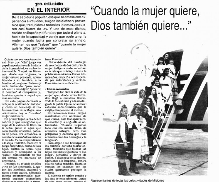 (Artículo publicado el 8 de marzo de 1992 en la sección "Primera Edición en el Interior")De la sabiduría popular, esa que se amasa con experiencia e intuición, surgen los dichos y proverbios que, traducidos a todos los idiomas, adquieren casi fuerza de ley. Y uno de esos dichos, nacido en España y difundido por todo el planeta, habla de la capacidad y coraje que suele tener la mujer cuando lucha por concretar su anhelo. Afirman los que "saben" que "cuando la mujer quiere, Dios también quiere".Quizás no sea exactamente así. Pero que "ella" juega un papel importante en la historia de la humanidad, es un hecho irreversible. Y aquí, en Misiones, desde sus orígenes, la mujer estuvo presente, apuntalando a su hombre, a la familia, al progreso. Estuvo -y está- luchando "para sacar adelante a sus hijos", "ponerle el hombro" al compañero y también ayudar a aquel que más necesita.En esta página dedicada a reflejar la realidad del interior, y como un homenaje al Día Internacional de la Mujer, nos referiremos hoy a "nuestra" mujer misionera.En primer lugar, a esa de tez cobriza y ojos renegridos que supo de la existencia libre en la selva, junto al agua que corre (corría) cristalina, poblada de peces. Era -entonces- la convivencia armónica con todo lo creado. Y ella, respondiendo a la vieja tradición, mantuvo el fuego encendido, cuidó de sus hijos, cultivó la tierra, tejió canastos y acompañó a su "caraí" sumisamente en pos del destino ya marcado de antemano.Después, su mundo de selva y río se fue achicando. Llegaron los hombres, mujeres y niños de piel blanca, hablando idioma incomprensible, queriendo Imponer costumbres distintas y cercando la tierra. Fue una retirada hacia la espesura, silenciosa, humillante. Y los árboles empezaron a caer, "todos" sin excepción. Y las armas de fuego atronaron en los montes, matando indiscriminadamente a los "bichos".El paisaje se fue transformando, se abrieron más y más picadas y por ellas fue entrando lo que los gringos llamaron "progreso". Y ella, cargando a los hijos pequeños, detrás del marido, se fue adentrando en el monte espeso, oscuro.Hubo, claro que sí, tentativas de trabajar con los recién llegados. Pero en el choque de las dos culturas, el más débil sucumbió. Por eso, para no perder totalmente su identidad, se fueron retirando y fueron exiliados en sus propias tierras: extranjeros en la región donde nacieron y donde duermen su sueño eterno los antepasados."Nuestra tierra sagrada -tierra de Dios- fue mancillada", explicaron a la cronista allá en "El Pocito" de Capioví, mientras su ágiles manos tallaban la madera para crear a los "amigos" (lechuzas, tucanos y coatíes) que van desapareciendo.Y mientras los hombres hablaban y tallaban, "ella", con su mirada triste, atizaba como antes, como siempre, el fuego junto al ranchito. En tanto que otra tejía un saco con lana que le habían regalado "la gente de Irma Prestes".Sobreviviente del naufragio de ese choque de dos culturas, la mujer indígena -cabe recordar- es la raíz que nutrió y nutre a la población misionera. En los últimos años, empezó a ser respetada por autoridades y vecinos, pero aún no es suficiente.Tristes recuerdosTampoco fue fácil la vida de la mujer que, desde otras latitudes, llegó a nuestras tierras. Todo le fue extraño y a la nostalgia de la patria lejana, se sumó el esfuerzo sobrehumano que le exigió el imponerse al medio.En conversaciones largas mantenidas con ancianas de ojos claros, casi transparentes, la emoción y la angustia se actualizaba. "Cuando llegamos todo eso era monte, lleno de animales salvajes. Pero más peligrosos y dañinos que esos animales eran las hormigas y la langosta"."Para alejar a las hormigas de los cultivos -contaba María Gerula- teníamos que buscar las hojas que más le gustaba a esa plaga, juntarlas y darles de comer a distancia de la chacra. En cuanto a la langosta… contra ella no había remedio. Hasta se comían las sábanas con las cuales queríamos proteger la huerta".El silencio se vuelve pesado y los ojos se ensombrecen. Luego de una corta pausa, retoma el hilo: "Yo vine de Ucrania con mis padres y hermanos y todos los chicos sufrimos mucho. Había que trabajar duro y mi padre no aflojaba. Mamá se pasaba llorando porque extrañaba a su familia. Después me casé y seguí laburando más que el hombre, pues había que ayudar en la chacra, cocinar, criar los hijos y también cortar las tablas para la casa".Otras ancianas de origen alemán contaban historias similares: "Venimos del Brasil y nos pasamos todo el tiempo en la chacra. Recién cuando mis hijos empezaron a ir a la escuela yo fui aprendiendo el castellano y eso me permitió comunicarme con otras personas".También los ojos de la "oma" se ensombrecen al referirse al ayer y solo recuperan su brillo cuando habla de los nietos, esos que -gracias a Dios- tienen una vida mucho más linda que la que tuvimos nosotros.Crisol de razasMás allá del Océano, el llamado "fenómeno Misiones" es investigado por gente sesuda que se adentra en la antropología y sociología. En Amsterdam, Holanda, existe un Instituto que ha llenado páginas respecto a "nuestra" realidad. Al parecer somos un caso único a nivel mundial y asombramos porque en "territorio tan reducido, y en perfecta armonía, convivan tantas nacionalidades".Y es verdad. Aunque no fue fácil, ni para los primeros habitantes de estas tierras ni para aquellos que vinieron a poblar Misiones, adaptarse y crecer juntos, lo cierto es que estamos conformando el tan mentado "crisol de razas". Recorrer los caminos del interior -especialmente para los turistas- es una permanente sorpresa. Niños rubios y morenos, luciendo guardapolvos blancos, concurren a las escuelas, olvidados (por suerte) de las dlferencias que separaron a sus abuelos. Rubios y morenos -adultos- trabajan y conviven en forma natural, participando de las mismas penas y alegrías en su actividad cotidiana. Ayer, en Oberá, la