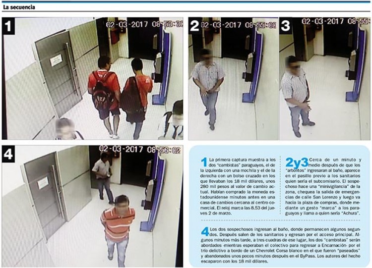 Las imágenes de las cámaras de seguridad explican en buena parte la premura con la que actuaron los investigadores. Para los detectives, las filmaciones no dejan lugar a dudas: en ellas se observa cómo quien sería el subcomisario detenido “marca” tras un breve seguimiento a los “cambistas” paraguayos a los que minutos después, junto a sus cómplices, despojaría de los 18 mil dólares con los que habían salido de una casa de cambios del microcentro posadeño.Esa, al menos, es la versión que surge del rompecabezas que construyen las autoridades de la causa por estas horas y que tiene, como principal elemento, el registro fílmico que acompaña -en exclusiva- este artículo de PRIMERA EDICIÓN.En ese documento se observa a dos hombres que serían los detenidos, es decir, el subcomisario de la Policía provincial y “Achura”. Hasta anoche la investigación en manos del magistrado Fernando Verón, titular del Juzgado de Instrucción 3 de Posadas, continuaba con la búsqueda del tercer involucrado, aún prófugo.La secuencia se inicia segundos después de las 8.53 del jueves pasado, hace exactamente una semana, en el acceso a un centro comercial de calle Bolívar, lindante a un bar que funciona en la escena. A esa hora, esa era la única puerta que estaba abierta.Las cámaras de seguridad del lugar captan el ingreso de los dos cambistas paraguayos, de entre 19 y 25 años. Y a los pocos segundos, también registran la llegada de los dos sospechosos, quienes serían el subcomisario y el civil detenidos el último lunes.Los extranjeros van directamente al sanitario del centro comercial. Un minuto y medio después aparecen en pantalla los sospechosos. El primero es un hombre de pantalón vaquero, camisa a cuadros y gafas que, para los investigadores, es el subcomisario. El segundo es un sujeto de chomba y jeans, de quienes los detectives sospechan que es “Achura”.El primero de esos involucrados revisa minuciosamente el pasillo previo a los baños y, con el área despejada, “marca” a las víctimas y llama con un gesto de manos a quien sería su cómplice, quien entonces aparece en la escena. Juntos van al baño y un minuto después dejan los sanitarios y se van del lugar por la puerta principal, que a esa hora ya estaba abierta.Imágenes determinantesLas imágenes son consideradas clave y pueden resultar determinantes en los avances que la investigación tenga en las próximas horas. Al respecto, trascendidos indicaron que continuaba anoche la búsqueda del tercer sospechoso involucrado en el hecho, quien no se descarta que también sea de la fuerza provincial o tenga algún tipo de vínculo.Por lo pronto, el subcomisario que prestaba servicios en la Dirección de Asesoría Previsional permanece tras las rejas junto a “Achura”, a disposición del magistrado Verón. Aún no fueron indagados, aunque todo apunta a que serán llevados ante el juez para ese procedimiento durante las próximas horas. En sede judicial también se aguarda por la presentación de las víctimas, que deben ratificar lo expuesto en la denuncia radicada el día del hecho en la comisaría seccional Primera de Posadas.En pleno microcentroComo este diario informó en exclusiva en su edición del último sábado, los dos “arbolitos” paraguayos denunciaron que cuando se aprestaban a tomar el colectivo internacional en la parada de Entre Ríos y Ayacucho fueron abordados por un hombre que les dijo ser policía y que los subió a la fuerza al Chevrolet Corsa blanco.En el interior del rodado había otros dos sujetos. El trío les dijo que podían “arreglar” con una suma para regresar a su país y evitar ser detenidos, pero los “cambistas”aseguraron no cometer ningún delito. Entonces fueron “paseados”por distintos sectores de la ciudad y posteriormente abandonados en el ByPass, cerca de Garupá. Tras robarle los 18 mil dólares, el trío se “apiadó” y les entregó 700 pesos para que regresaran a su país.Hecha la denuncia, se desató una investigación que arrojó resultados positivos el último lunes con la detención del subcomisario y “Achura”. En la casa del funcionario policial los detectives se toparon con 2.800 dólares que estaban escondidos en la gorra policial del uniformado, además de poco más de 700 gramos de marihuana, razón por la que ahora deberá responder también ante la Justicia Federal.En los procedimientos también fue secuestrado el Chevrolet Corsa blanco en el que el trío habría “paseado” a los cambistas por la ciudad. Ese rodado, como este diario informó ayer, pertenece al área en el que se desempeñaba el subcomisario arrestado.Piden excarcelación para el uniformadoMientras la investigación encabezada por el magistrado Fernando Verón avanza, las fuentes informaron ayer -miércoles- a PRIMERA EDICIÓN que la defensa del subcomisario presentó un pedido de excarcelación que ahora deberá ser analizado por el magistrado interviniente.La presentación fue realizada por una abogada del fuero local, quien asumió -al menos primeramente- la defensa del alto oficial involucrado en la investigación.No obstante el expediente que se abrió ante la Justicia ordinaria, el uniformado también deberá responder por una causa ante el Juzgado Federal de Posadas, en virtud de los casi 800 gramos de marihuana hallados en su vivienda del barrio Itaembé Guazú de Posadas.
