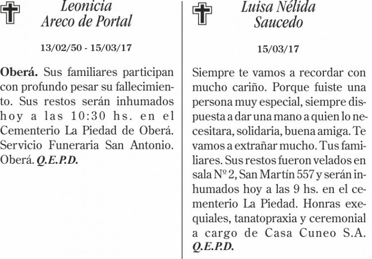 Fúnebres del jueves 16 de marzo de 2017