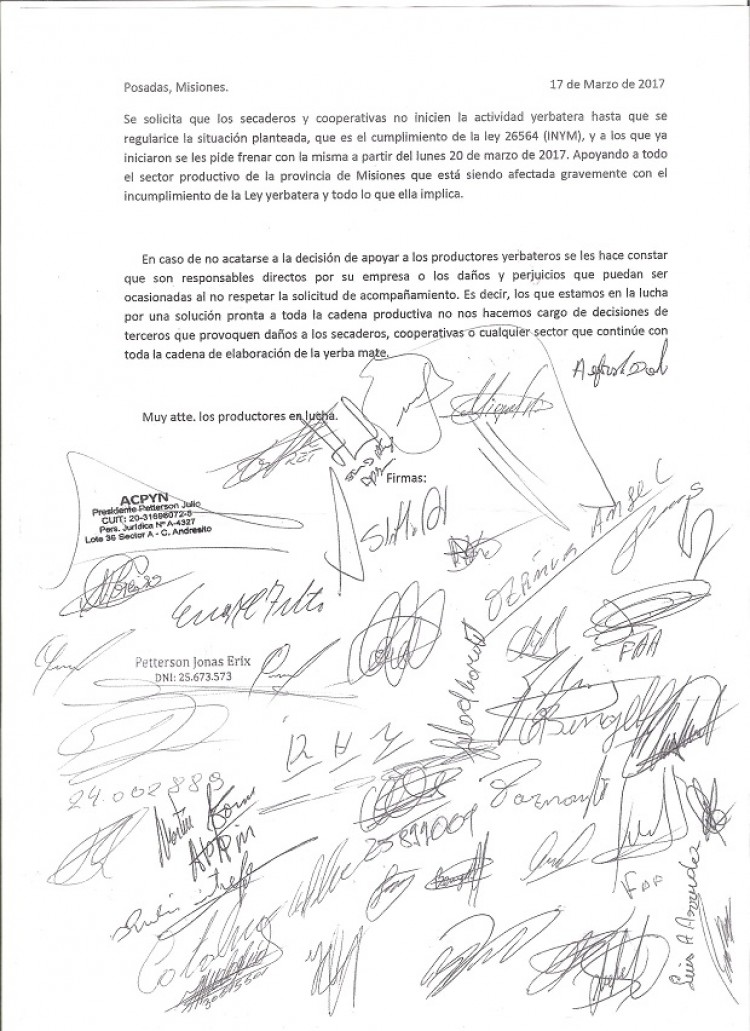 Llamó poderosamente la atención la velada amenaza de los productores, ya que en otra parte del comunicado expresan que "en caso de no acatarse la decisión de apoyar a los productores yerbateros, se les hace constar que son responsables directos por su empresa o los daños y perjuicios que puedan ser ocasionados".Y además "a quienes ya empezaron, se les exige que la frenen a partir de este lunes 20, y hasta que se regularice la situación planteada". La convocatoria se realizó mediante un comunicado firmado por varios colonos que realizan el acampe en Posadas, que continuará al menos hasta el lunes cuando habría una nueva asamblea para resolver el conflicto.