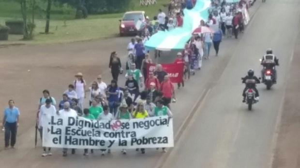 Unas 200 personas secundadas por más de 50 automóviles se movilizan por la ruta nacional 12. Se prevé que a la columna de docentes, trabajadores de diferentes sectores, desocupados, campesinos y jubilados se sumen más manifestantes a medida que avancen. Gendarmería y la Policía resguarda la marcha.