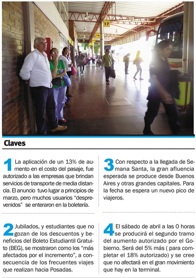 Tomó por sorpresa, a usuarios desprevenidos, la aplicación de entre un 8% y 13% de aumento en el costo del pasaje, autorizado a principios de este mes por el Gobierno provincial a las empresas de servicios de transporte de media distancia.Jubilados y estudiantes que no gozan de los descuentos y beneficios del Boleto Estudiantil Gratuito (BEG) se mostraron como los “más afectados por el incremento”, a consecuencia de los frecuentes viajes que realizan hacia la Capital provincial. Así se desprendió de un sondeo informal de PRIMERA EDICIÓN entre viajeros que transitan la Terminal de Ómnibus capitalina, donde todos los consultados declararon “haber sido afectados”, en mayor o menor medida.“Grande fue nuestra sorpresa, cuando al comprar los pasajes para venir a Posadas, tuvimos una suba del 5%”, contó a éste Diario, Gilberto Luis Gularte, jubilado al igual que su esposa, Gladyz Esther Cuba, quienes permanentemente usan el servicio para trasladarse desde Santa Ana hacia esta ciudad para buscar atención médica o bien realizar trámites en el Pami. La pareja explicó que pasó de pagar 27 a 35, pero que el porcentaje de aumento más fuerte lo absorben el común de los usuarios, quienes pasaron de pagar 27 pesos a los 50 pesos actuales.Otra suba en puertaSin embargo, el incremento aplicado la semana pasada -aunque fue el porcentaje más alto dispuesto por la Provincia (13% de los 18% totales en dos tramos), todavía resta un elevar un 5% más, lo cual ocurrirá a partir de las 0 horas del sábado 1º de abril. Doce días antes del Jueves Santo, y del inicio de la temporada en la cual la demanda del servicio llega a uno de sus picos más altos.El impacto en el bolsillo de los usuarios se hace sentir “porque nuestros sueldos no suben en la misma medida que los servicios, por ejemplo”, cuestionó Francisca (quien pidió mantener su apellido en reserva). La mujer estuvo ayer en Posadas proveniente desde Colonia Taranco Grande (Cerro Azul).Al igual que otros consultados, ella es jubilada, y explicó que – aunque no viaja seguido – “la suba me afectó, porque tampoco tengo tantos ingresos como para sostener todas las subas; sin embargo como mi hija estudia en Posadas, el costo ya era dificultoso de sostener antes de la suba”, relató con pesar.El pasaje de Cerro Azul hasta Posadas está 71 pesos y los jubilados pagan 50, cuando hasta hace dos semanas abonaban 35 pesos.Desde y hacia otras provinciasAlberto Arriola y Esferilda González, ambos provenientes de Ita Ibaté (Corrientes), también relataron haberse llevado un mal momento en la boletería porque, para ellos, “volvió a subir el pasaje hacia Posadas. Ya habíamos pagado con incremento hace dos meses”, contaron enojados y, según su relato, en menos de un año “el aumento fue de 100 pesos a 300 actuales”.“Si al menos mejorara el servicio no iba a causar tanto enojo, pero cada vez es peor y parece que falla el control: los aires acondicionados no andan, viajar en verano fue crítico porque además no se hace una limpieza adecuada a los baños y así el viaje se vuelve una pesadilla. Te cobran una barbaridad y realmente, salvo poquísimas excepciones, son un desastre brindando el servicio”. Fuerte actividadMarzo es un mes de alto tránsito de pasajeros en la Terminal de Ómnibus de Posadas, “con un promedio de 14 mil personas por día”, confió su administrador, Luis Fiege, consultado sobre cómo afectan – en el movimiento rutinario – los incrementos aplicados recientemente.Asimismo, el funcionario relató que una cifra importante – cercana al 50% de los usuarios de la terminal están en tránsito desde y hacia Encarnación (Paraguay). “Vienen desde distintos puntos de la provincia y del país, con fines de ir de compras hacer rendir su dinero y no hemos sentido que haya habido una merma en la demanda de los servicios. No llegan todos los coches llenos, pero sí con una cifra de 20 pasajeros promedio”, explicó.Con respecto a la llegada de Semana Santa, la gran afluencia que se espera es desde Buenos Aires y otras grandes capitales “que todavía no incrementaron los costos en sus pasajes. Esperamos para esa fecha un nuevo pico de viajeros”, confió Fiege.