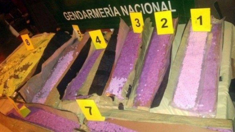 El cargamento fue encontrado y secuestrado este martes por efectivos de Gendarmería Nacional apostados en el puesto caminero "Fermín Rolón", en el acceso a la ciudad de Clorinda por ruta nacional 11.Cuando el personal del control efectuó la verificación en la bodega del colectivo de larga distancia les llamó la atención el excesivo peso para el tamaño de las valijas, lo que alertó sobre una posible carga ilícita.Ante esta situación se solicitó la presencia del propietario de las valijas, detectándose que correspondía a un hombre de 20 años de edad oriundo de Villa Elisa, Republica del Paraguay, que quedó preso."Las valijas tenían doble fondo, cuando se procedió a cortar la tela que recubre el interior se pudo observa que había paquetes envueltos con cinta de embalar conteniendo una gran cantidad de pastillas de diferentes tamaños y colores similar al éxtasis", comentaron al diario Crónicas de Clorinda fuentes de Gendarmería.El personal especializado procedió a realizar la prueba correspondiente, dando como resultado que son de alta pureza de éxtasis, marcadas con inscripciones bajo relieve "Roll Royce" (color amarillo) y "Pikachu" (color rosado).Este miércoles, mientras se contabilizaban las pastillas se labraron las actuaciones correspondiente al tiempo que se informaba al Juez Federal de Formosa sobre la detención y el procedimiento llevado a cabo por el personal de Gendarmería. Las pastillas estaban "perfectamente acondicionada en cartones y adheridas con un pegamento" a tiras de "placas radiográficas" de "unos 60 centímetros de largo por 20 de ancho; y papel carbónico con el objetivo de evitar ser distinguidos por los rayos de los scanner", indicaron las fuentes.En una de las valijas "donde también había ropa" se contabilizaron 27 mil pastillas "con una prolijidad increíble, nunca vista en esta zona", agregaron los voceros del operativo."Mientras se busca a un posible cómplice" de la carga, esta madrugada continuaba el trabajo de conteo de las pastillas bajo las órdenes del juez federal subrogante de Formosa, Juan Carlos Vallejos, fiscalía de Luis Benítez.Fuente: Agencia de Noticias NA