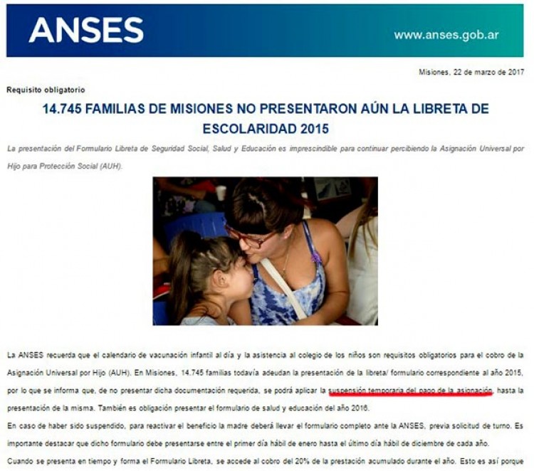 La Administración Nacional de la Seguridad Social (Anses) recalcó que el calendario de vacunación infantil al día y la asistencia al colegio de los niños son requisitos obligatorios para el cobro de la Asignación Universal por Hijo (AUH). Sin embargo, "en Misiones, 14.745 familias todavía adeudan la presentación de los documentos correspondientes a 2015, por lo que, de no hacerlo a la brevedad, podrían sufrir la suspensión temporaria del pago de la asignación hasta que se haga efectiva dicha presentación", afirma la Anses en un comunicado. También es obligación presentar el formulario de salud y educación del año 2016, advirtieron. En caso de haber sido suspendido el beneficio, para reactivarlo la madre deberá llevar el formulario completo ante la Anses, previa solicitud de turno. Pasos para la presentación1. Ingresar en www.anses.gob.ar, opción Prestaciones y Servicios, apartado Asignaciones Familiares. Una vez allí, pulsar en el margen izquierdo Asignación Universal por Hijo, ir a Formularios, elegir el PS 1.47 DDJJ Asignación Universal e imprimirlo. 2.Llevarlo a la escuela para que las autoridades educativas lo completen y firmen. 3.Acudir con el niño al centro de salud para que le realicen los controles o apliquen las vacunas y lo certifiquen en el Formulario Libreta. 4.Pedir un turno en www.anses.gob.ar y presentar el PS 1.47 completo en las oficinas de la ANSES en la fecha y horario asignado en el turno.