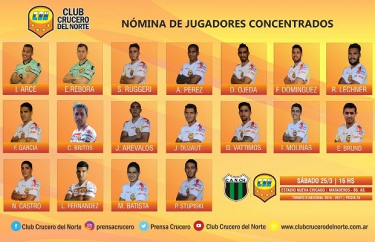 El mediocampista ofensivo José Dujaut y el delantero David Váttimos se recuperaron de sendas molestias físicas y están en condiciones de ingresar al equipo principal de Crucero del Norte, que este sábado se enfrentará a Nueva Chicago, en partido correspondiente a la fecha 24 del torneo de la Primera B Nacional.El técnico Héctor Rivoira no confirmó la alineación titular pero se desprende que tanto Dujaut como Váttimos estarían en el once de arranque en Mataderos, este sábado a las 16:00.En cambio, ni Guillermo Sotelo ni Lucas Vera Piris, ambos titulares en el 0-2 ante Gimnasia de Jujuy, integran la delegación que viajó a Buenos Aires. La lista de 18 jugadores que estará a disposición del DT "Colectivero" es la siguiente: Ignacio Arce y Emilio Rébora (arqueros); Alejandro Pérez, Federico Domínguez, Stephan Ruggeri, Rodrigo Lechner, Delio Ojeda y Federico García (defensores); Christian Britos, Joel Arévalos, José Dujaut, Enzo Bruno, Iván Molinas y Nicolás Castro (mediocampistas); David Váttimos, Leandro Fernández, Pablo Stupiski y Maxi Batista (delanteros).Fuente: Télam