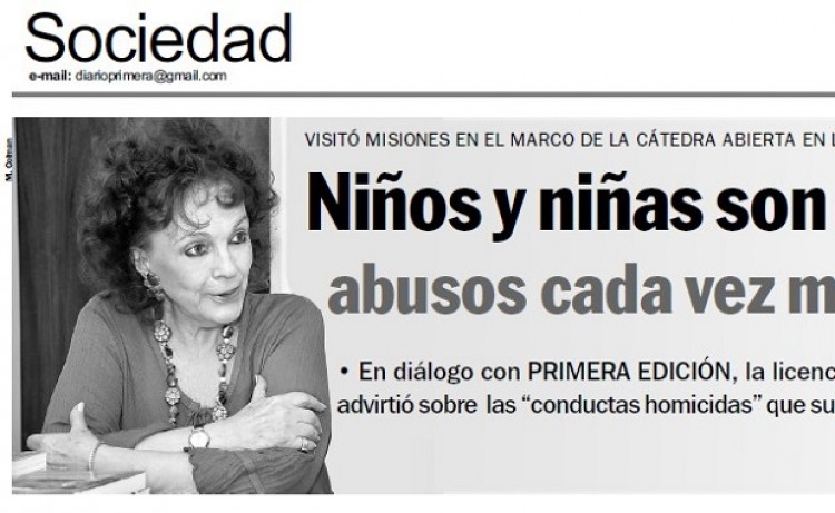 (Nota completa publicada el 26 de marzo de 2012)En todo el país la violencia intrafamiliar escala niveles de crueldad cada vez más extremos y las mujeres y niños aparecen entre las víctimas más vulnerables. Según Eva Giberti, licenciada en psicología y docente universitaria, “la falta de respeto humano en relación con niños y niñas es algo grave”.“No hay que asombrarse cuando alguien dice ‘esta madre mató a su hijo, ¡qué barbaridad!’, esto es el hecho como algo espectacular (de gran impacto periodístico), pero hay un alto porcentaje de niños y niñas maltratados violados”, señaló Giberti en una entrevista exclusiva con PRIMERA EDICIÓN durante su visita a Posadas en el marco de la Cátedra Abierta Sobre las Violencias de Géneros, que dirige desde 2011 en la Facultad de Humanidades y Ciencias Sociales de la Universidad Nacional de Misiones.“Todos los días las madres y los padres tienen conductas que no son amorosas, son muchas veces homicidas y de mucho maltrato”, agregó, destacando que muchas veces los propios padres “no le creen a los chicos cuando les dicen que alguien los está molestando, lo que quiere decir que lo está toqueteando; pero hay que creer, intervenir inmediatamente. Los niños y niñas dependen de nosotros, de los adultos. No tienen defensa y es una inmoralidad abusar de ellos en el modo que se hace hoy en día”.Según datos del programa “Las víctimas contra las violencias”, del Ministerio de Justicia y Derechos Humanos de la Nación -en que Giberti participa-, más del 50% de las 937 víctimas de delitos contra la integridad sexual atendidas en Buenos Aires en 2011 son niños.Y cada uno de estos casos encierra una descripción aportada por las víctimas, niños y niñas de cero a 18 años, en las que describen que fueron tocadas sexualmente por la fuerza, forzados a mantener relaciones sexuales vaginales, anales u orales, entre otros.Por supuesto que estos datos no se reducen a Buenos Aires, ya que, según Giberti, “estamos trabajando en Chaco, Misiones, Entre Ríos, Río Negro, Santiago del Estero y La Pampa y encontramos permanentemente la falta de respeto a la vida de los chicos y chicas”.“Una gran falta de respeto”Una semana atrás los medios de comunicación de Corrientes daban a conocer que una niña de diez y otra de doce que habían sido violadas cursan riesgosos embarazos.Consultado al respecto, Julián Dindart, ministro de Salud de esa provincia, había manifestado que “algunas se embarazan hasta porque tienen un recurso económico como premio”.Giberti definió los dichos de Dindart como “una falta grave” y que “no podemos pedir que en la comunidad se respete a las mujeres cuando desde ámbitos del poder se les falta el respeto”.Manifestó que “los dichos de ese funcionario son el paradigma de lo que significa la falta de respeto hacia la víctima, el modelo de lo que no debe hacer ningún ser humano. Y si además esa víctima es una niña, se ha perdido toda la prudencia, toda la discreción que está obligado a tener un adulto en la relación social con una criatura. Porque hacer apreciaciones de esta índole, en primer lugar, son aventuradas; segundo, son descalificantes, y tercero, transforma el comentario en una forma de humillación”.La especialista subrayó que esta intervención mediática de Dindart “es violatoria de la Ley 26.485 de ‘Protección Integral para prevenir, sancionar y erradicar la violencia contra las mujeres’, porque es plantear una suposición acerca de algo que él desconoce y que implica poner bajo sospecha a la víctima. Como de costumbre, este es un padecimiento de todas las víctimas, que suelen ser puestas bajo sospecha, sobre todo si son mujeres”.Asimismo, Giberti señaló que “este funcionario deberá recapacitar personalmente y quienes lo rodean tienen que ayudarlo a salir de ese mundo en el que el piensa que se puede humillar a la víctima, descalificándola a partir de la sospecha”.Mirar desde los saberes popularesLas situaciones de maltrato, de violencia contra los niños se complejizan cuando, por ejemplo, la madre fue víctima de abusos cuando era niña, entonces le puede parecer normal que a la criatura le pase lo mismo, analizó Giberti.Para abordar estos casos de violencia, recomendó lo que desde la Cátedra Abierta vienen trabajando desde octubre con profesionales de diferentes disciplinas. “La Cátedra Abierta es una estrategia que se está aplicando mucho en América Latina y es un modo de incorporar los saberes populares, la cultura popular en la universidad”, señaló.Entre los sesenta participantes de este espacio en la Facultad de Humanidades y Ciencias Sociales hay abogados, médicos y profesionales de la salud, trabajadores sociales, comunicadores, etcétera.Como ejemplo de esta estrategia de trabajo indicó que “cuando hay que trabajar con una víctima de violencia familiar solamente desde lo que aprendiste en la universidad y esa víctima está en un barrio marginal que tiene sus propios códigos, manera de hablar, costumbres, lo más probable es que vos quieras cambiarla, criticarla, preguntarle porqué hizo algo de un modo u otro, en lugar de empezar al revés, buscando conocer esos saberes, buscando entender a esa persona”.“Claro que un caso de violencia, de abuso, es un delito, pero antes de (buscar) hacer justicia hay que empezar a entender las costumbres, pensarlas, estudiarlas y estar muy atento al modo de vida de la gente con la que los universitarios trabajamos, porque los universitarios no somos quienes tenemos todas las verdades. Conocemos algunas cosas, pero las poblaciones tienen sus propios ritos, culturas, criterios lógicos”, agregó.En relación a esta estrategia de trabajo, destacó que “lo importante es que poco a poco desde los barrios incorp