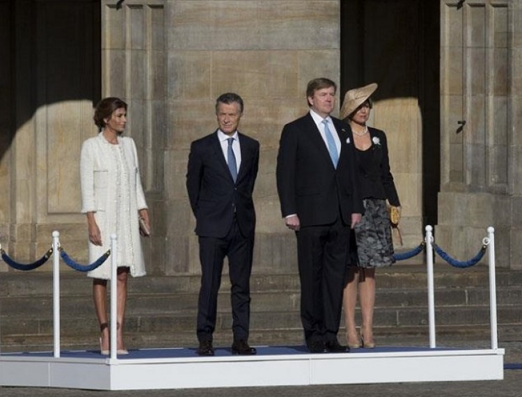 El presidente Mauricio Macri y la primera dama, Juliana Awada, fueron recibidos este lunes con honores por los reyes de Holanda, Willem-Alexander y Máxima, en la céntrica plaza Dam de Ámsterdam, al inicio de su visita de Estado al país europeo, entre gritos de apoyo y de rechazo de manifestantes argentinos. Puntuales, como marcaba el protocolo, el matrimonio presidencial y la pareja de soberanos salieron caminando juntos por una de las puertas principales del Palacio Real, situado en la misma plaza, y se dirigieron a un podio desde donde siguieron la ceremonia bajo un brillante sol primaveral. La banda de la Guardia Real interpretó los himnos de Argentina y los Países Bajos (Wilhelmus), y luego el rey Willem-Alexander y el presidente Macri pasaron revista a la guardia de honor. <p lang="es" dir="ltr">Ceremonia de bienvenida con los Reyes de los Países Bajos, Guillermo y Máxima <a href="https://t.co/2vxyDCFus5">pic.twitter.com/2vxyDCFus5</a></p>— Mauricio Macri (@mauriciomacri) <a href="https://twitter.com/mauriciomacri/status/846308842547896321">27 de marzo de 2017</a>u000AEn ese momento, una treintena de simpatizantes de Macri comenzaron a corear a los gritos "¡si, se puede!, ¡si, se puede!" desde el lado izquierdo del podio, mientras el presidente y el rey iban caminado, .Desde el otro extremo de la plaza, se manifestó otro grupo convocado por la agrupación H.I.J.O.S que gritaron a coro "Panamá, Panamá, la plata donde está" y luego una activista con un megáfono dijo "son 30.000 los desaparecidos, Macri no lo olvides".Desde el podio, la reina Máxima, vestida con una pollera floreada y un sombrero, y Juliana Awada, quien lucía un vestido y tapado claro, observaron estoicas el contrapunto entre ambas manifestaciones.La breve ceremonia finalizó con las dos parejas regresando hacia la entrada principal del Palacio Real, donde posteriormente tendría lugar la habitual recepción a las autoridades holandesas y argentinas que acompañan al presidente, entre ellos la canciller, Susana Malcorra, el ministro de Educación, Esteban Bulrich, y el de Trabajo, Jorge Triaca. Una vez concluido el acto, los dos grupos de manifestantes retomaron con más ímpetu sus cánticos, poniendo en evidencia las diferencias entre los argentinos residentes en los Países Bajos. Los argentinos que querían mostrar su apoyo al presidente portaban banderas nacionales. "Estamos contentos de tener al presidente acá, es una buena oportunidad para Argentina", dijo a Télam Natalia Díaz Romero, una de las manifestantes. "Sabíamos que habían convocado una protesta en repudio a la visita, por eso queríamos estar aquí, porque en las elecciones, el 95% de los argentinos que votaron en Holanda lo hicieron por Macri", apuntó Natalia. Mientras tanto, en el polo opuesto, los detractores del presidente elevaban el tono. Una manifestante de nombre Alejandra cantaba, megáfono en mano, "Macri, vos sos la dictadura". Siguiendo con el protocolo, el presidente Macri regresó a la plaza Dam minutos después para hacer una ofrenda floral en el Monumento Nacional, que recuerda a los caídos en la Segunda Guerra Mundial. El Monumento Nacional, un enorme monolito cónico de piedra blanca de 22 metros de altura, diseñado por Jacobus Johannes Pieter Oud, fue inaugurado el 4 de mayo de 1956, fecha en la que cada año las autoridades rinden homenaje a los caídos. Macri y Juliana Awada caminaron desde el Palacio Real hasta el monolito, ubicado a menos de 100 metros. A su llegada, la pareja presidencial saludó a las banderas y pasó revista a las tropas, y tras la colocación de la corona de flores, se dio paso a un minuto de silencio y un saludo de honor a los militares. El acto concluyó con música interpretada por una orquesta y con ello también terminaron las manifestaciones de los residentes argentinos.Fuente: Télam