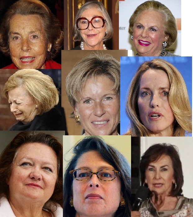 Por segundo año consecutivo, Liliane Bettencourt, del imperio de cosmética y belleza L’Oreal, es la mujer más rica del mundo con una fortuna estimada en 39.500 millones de dólares (36.355 millones de euros). Sin embargo, ocupa el número 14 en la lista completa, ya que los 13 primeros son hombres. Bettencourt posee un tercio de L’Oreal junto con sus hijos. Su padre, Eugene Schueller, fundó la compañía en 1907 y falleció en 1957. La multimillonaria, que hoy tiene 94 años y sufre de demencia, está sumida en una batalla legal contra su ex confidente y fotógrafo, Francois-Marie Banier, quien en 2016 fue condenado por una corte de apelaciones francesa a pagar una multa de 400 mil dólares y a renunciar a 90 millones de dólares en activos, después de que en 2015 fuera declarado culpable de estafar a Bettencourt. La segunda (17ª del global) es Alice Walton. Tiene una fortuna estimada en 33.800 millones de dólares, 1,500 millones más que el año pasado. La única hija del fundador de Wal-Mart, Sam Walton, no ha asumido un papel activo en el negocio familiar, pero es la mujer más rica de Estados Unidos, principalmente por su participación en acciones de la cadena de supermercados y el elevado pago de los dividendos. Ella es una de las cuatro mujeres Walton en las filas de los multimillonarios, que en conjunto tienen un patrimonio neto de 49.500 millones de dólares. Los otros integrantes del listado son su cuñada Christy Walton (la viuda de su hermano John) y sus primos, Anne Walter Kroenke y Nancy Walton Laurie.Jacqueline Mars ostenta la tercera posición con un patrimonio de 27.000 millones de dólares. Su abuelo, Frank Mars, fundó en 1911 la mayor fábrica de dulces del mundo: Mars Inc.La cuarta es la italiana María Franca Fissolo, quien posee 25.200 millones de dólares. Su suegro creó Nutella y su difunto esposo, Michele Ferrero, fundó el Grupo Ferrero con marcas como Ferrero Rocher, Kinder Chocolate y Tic Tacs.Susanne Klatten se sitúa en la quinta posición de esta lista con un patrimonio de 20.400 millones de dólares. La alemana es la heredera de BMWLa viuda de Steve Jobs, Laurene Powell Jobs, es sexta con una fortuna estimada en 18.404 millones de euros, proveniente de sus acciones en Apple y Disney.La estadounidense Gina Rinehart, heredera y jefa del grupo Hancock Prospecting, dedicado a la extracción de minerales, tiene una fortuna de 15.000 millones de dólares. Abigail Johnson, presidenta y CEO para Estados Unidos de Fidelity Investments (FMR) y presidenta de la compañía gemela Fidelity International (FIL), ocupa el octavo puesto de esta lista gracias a su patrimonio de 14.400 millones de dólares.Iris Fontbona, de 72 años y matriarca del clan Luksic, ocupa el noveno puesto en la lista de las mujeres más ricas del mundo gracias a su patrimonio valorado en 12.609 millones de euros. Es la viuda de Andrónico Luksic, fundador del Grupo Luksic.La última mujer de la lista, Beate Heister, se esconde de la escena pública todo lo que puede y por eso no hay imágenes disponibles de ella. Es la hija de Karl Albrecht, fundador de los supermercados Aldi. Su patrimonio se estima en 13.600 millones de dólares (12.517 millones de euros).Fuente: diario El País (España)