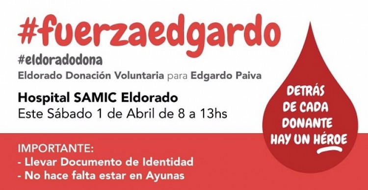 La próxima colecta se realizará en el hospital Samic de Eldorado este sábado 1 de abril de 8 a 13 horas. Es importante llevar documento de identidad, no hace falta estar en ayunas y quien no pueda concurrir el sábado, lo puede hacer el lunes 3 de abril."Donar sangre es muy sencillo, elegí dar lo mejor de vos, elegí ser donante, elegí continuar vida, elegí ayudar a Edgardo", manifestaron desde la organización.