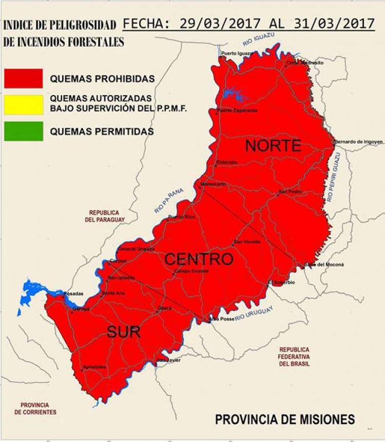 Luego de la intensa lluvia que se produjo a principio de marzo, incluso por encima de los valores estimados por los especialistas para todo el mes en un sólo día, se produjo un período con muy pocas precipitaciones que complicó el panorama de los campos, donde la pastura empieza a secarse con rapidez elevando al índice extremo de peligrosidad de incendios, de acuerdo a los niveles de advertencia de los especialistas del Plan Provincial de Manejo del Fuego, dependiente del Ministerio de Ecología y Recursos Naturales Renovables.Se trata de la primera advertencia extrema del año para toda la provincia, ello quiere decir que queda completamente prohibida la quema de pastizales sin previa autorización de los especialistas que monitorean que esa actividad se cumpla con los recaudos y medidas de seguridad tendientes a evitar que por algún descuido o la acción propia del viento provoque la expansión del fuego en forma descontrolada.De acuerdo a los reportes, se aguardan dos semanas secas, sin lluvias significativas que alcancen a revertir los índices actuales de incendio, por lo que se solicitó a los encargados de efectuar las tareas de rozado de los campos a postergar esa labor para más adelante. La última vez que ocurrió una situación como la actual fue en noviembre de 2016, cuando también la restricción alcanzó a todos los puntos de Misiones. Durante el último verano solamente se produjeron sequías pronunciadas en determinadas localidades, no siendo generalizada.A través de las redes sociales se puede observar el cuadro de advertencia del Plan Provincial de Manejo del Fuego, con asiento en Apóstoles, que tiene una vigencia desde la víspera y hasta mañana. De acuerdo a lo manifestado por los expertos, actualmente existe un importante volumen de pastizal que todavía está verde en los campos. Cuando llegue el momento de las primeras heladas y viento norte, esos terrenos dispondrán de colchones de pastos secos y estarán muy predispuestos a cualquier incendio.
