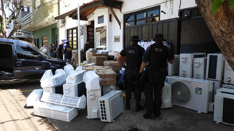 Tras cuatro meses de investigación personal de la delegación local de la Policía Federal Argentina (PFA) desbarató ayer -jueves- una organización dedicada al contrabando a gran escala de electrodomésticos y artículos varios sin aval aduanero, indicaron fuentes de esa fuerza. En el marco del operativo <a href="http://www.primeraedicion.com.ar/nota/243300/cuatro-detenidos-por-contrabando-en-posadas-fotos-y-video.html">se concretaron tres allanamientos, en distintos domicilios de los barrios Yohasá y Yacyretá de la capital provincial,</a> arrojando como resultado el decomiso de numerosos elementos (entre ellos cinco vehículos) y la detención de dos hombres. También fue demorada una mujer que posteriormente recuperó la libertad (aunque supeditada a la causa). Alrededor de 40 efectivos policiales participaron de las requisas simultáneas de los tres domicilios que estaban en la mira, orden judicial mediante. Flagelo Este operativo tuvo como objetivo desbaratar una banda que perjudicaba con su accionar al comercio local en general, teniendo en cuenta que se trata de una maniobra de fraude y evasión de impuestos explicaron las fuentes. En los allanamientos se logró secuestrar unos 40 aires acondicionados sin aval aduanero, además de al menos cinco vehículos -uno de ellos una camioneta-, que se presume eran utilizados para el transporte de dichos elementos. También se incautaron 70 cajas de cigarrillos ilegales -de procedencia extranjera y de distintas marcas y modelos-, como así también dinero en efectivo (cerca de 500 mil pesos), precisó un vocero. Los pesquisas hallaron durante los procedimientos media docena de teléfonos celulares, prendas de vestir, entre otros objetos que son de interés para la causa.Según se pudo establecer, el valor en plaza de las mercaderías secuestradas y que se cree estaban a punto de ser comercializadas alcanzó un valor aproximado de 3 millones de pesos. Conforme a la investigación se cree que esta organización enviaba los aires acondicionados y mercaderías a distintos puntos del país, obteniendo ganancias “libres de impuestos”, por tratarse de una maniobra de contrabando. A modo de colaboración durante los operativos prestó colaboración Prefectura Naval Argentina (PNA). Interviene en el hecho el Juzgado Federal de la ciudad de Posadas.