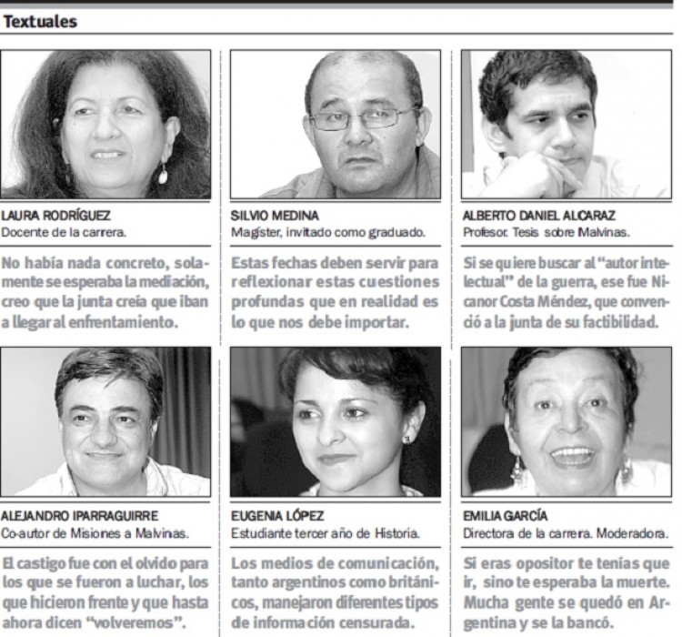 que manejaba la junta militar, para lograr recuperar la legitimidad que estaba perdiendo el gobierno, debido el descontento entre la población por la situación económica como resultado de la apertura indiscriminada a las importaciones, que dejaban sin trabajo a mucha gente. Si se quiere buscar al ‘autor intelectual’ de la Guerra de Malvinas, ese fue Nicanor Costa Méndez -esto lo sostengo en base a documentación secreta divulgada a años de la guerra-, quien por entonces era embajador argentino en Estados Unidos. Fue Costa Méndez quien convenció a los altos jerarcas de la junta de que era factible iniciar un conflicto armado porque Argentina contaba con el apoyo de EEUU, por la forma en que se había llevado la lucha contra el comunismo en la región. No hay que olvidar que en el año 1978 la misma hipótesis de conflicto casi desató una guerra con Chile por el Canal del Beagle. También hay que recordar que desde 1979 se estaba desarrollando la guerra de Afganistán con tácito apoyo de Estados Unidos, que entregaba armas y asesoramiento a los talibanes que luchaban contra la URSS, país al que paradójicamente Argentina exportaba trigo y tal vez consideraba que la cuestión iba a ayudar a definir una política más clara de EEUU para ganarse como aliado a Argentina en su lucha contra el comunismo”.En coincidencia, para Laura Rodríguez, “la decisión de invadir las islas tenía que ver con una relación estrecha que Leopoldo Galtieri tenía con Estados Unidos, por la participación argentina en la lucha contra la guerrilla comunista. Argentina envió soldados a luchar contra el comunismo a algunos países sudamericanos. En esta situación coyuntural creyeron que contaban con el apoyo de EEUU, por lo menos con una intervención de mediadores. Cuando Estados Unidos tuvo que decidir entre el aliado del sur o su aliado histórico, como lo era Inglaterra. No había nada concreto, solamente se esperaba la mediación, creo que ni siquiera la junta pensaba que iban a llegar al enfrentamiento, se creía que la intervención iba a ser anterior y no se iba a llegar a lo que después fue”. Prosiguió Alcaraz: “La Argentina del 82 no era la misma que ahora. Por entonces todavía no se había dado ese vaciamiento que tienen hoy las Fuerzas Armadas. No obstante se dice que el armamento era defectuoso y muchos ex combatientes cuentan que no funcionaban sus ametralladoras porque las municiones estaban en mal estado. Eso demuestra, entre otras cosas, que además del armamento defectuoso, lo apresurado que fue todo esto, sin mencionar que se mandaron conscriptos a enfrentar a soldados profesionales, esto pone de relieve el nivel de improvisación con que se manejó el conflicto. No quiero decir que Argentina hubiera tenido chances, sino que el conflicto se manejó con improvisación”.La verdad incómodaEl análisis de la información periodística que se brindaba, tanto en Argentina como en Gran Bretaña, en esos años de guerra también fue un punto relevante de la charla, mediante la visión de la estudiante Eugenia López, para quien “en realidad los medios de comunicación manejaron diferentes tipos de información. Estaban los diarios de noticias cotidianas que comentaban cuestiones pintorescas sobre la guerra. Todo tenía un trasfondo ideológico para poder convencer y legitimar al aparato estatal que estaba operando en el país en ese momento. Amén de que hubo medios totalmente censurados e incluso en los años posteriores a la guerra se prohibió la entrada de periodistas a Malvinas”, explicó, a la vez que subrayó que en el foro de discusión sobre Malvinas participó un especialista británico quien hizo un análisis de la información que se daba en la época, “se hablaba de la guerra, pero obviamente desde el punto de vista británico”.A esto Iparraguirre agregó: “El caso de los pilotos de la misión argentina que hundió al destructor inglés Sheffield, después de que ocurrió el hundimiento del Belgrano. Esa noticia llegó a los británicos muy filtrada, incluso ellos tampoco se enteran inmediatamente”.“El país estaba envuelto en una guerra y en una situación así, el periodismo deja de tener libertad porque es censurado completamente. En Inglaterra los medios también estaban censurados, sólo se pasaban los partes de guerra favorecedores. Ocurre que la verdad es siempre la primera víctima de la guerra y el periodismo no está fuera de ese contexto”, apuntó.Para la profesora Emilia García, “hubo muchos periodistas que por la censura se fueron al exterior inmediatamente. Porque si eras opositor sí o sí te tenías que ir, sino te esperaba la muerte, y hubo muchos casos. Los que sabían qué estaba pasando apenas lo decían. Acá no se podía comunicar otra cosa que no dijera la junta, por eso todo el tiempo estábamos ganando, hasta que nos enteramos de que terminó y perdimos”.Revelaciones recientesEn un explayado análisis, el docente Alberto Alcaraz analizó: “La guerra, lo que produjo fue interrumpir una negociación diplomática que se venía dando, aunque con altibajos, debido a los bruscos cambios de gobierno producidos por los golpes de estado de los años anteriores a 1973. De hecho, fue Arturo Illia quien empezó las negociaciones para la entrega diplomática de las islas. Recientemente, la cancillería británica reveló que tenía la intenciones de negociar algo parecido a lo que se hizo con Hong Kong en 1999, porque Malvinas era un territorio ultramar que costaba mucho mantener, en una época que no se sabía aún de la existencia de petróleo, un recurso por el que quizás estaban dispuestos a ir a la guerra, después de la gran crisis mundial de 1973, en la que los países de la OPEP exigieron precios más elevados. Viéndolo en perspectiva, el intento de recuperación de las islas por la fuerza, lo que trajo hasta el día de hoy es el corte de esas relaciones y negociaciones diplomáticas y que lo estamos pagando como erro