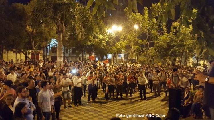 La Plaza de Armas muestra una importante afluencia de ciudadanos que se manifiestan en defensa de la democracia y de la Constitución Nacional, por sobre el atropello y la violencia.Los manifestantes abogan por una manifestación pacífica sin dejar de emitir el repudio ante el atropello constitucional, la represión y el asesinato del joven Rodrigo Quintana. <p lang="es" dir="ltr">[VIDEO] ????Momento en que una manifestante pasa las vallas de seguridad para entregar flores a la policía, en son de paz. Vía <a href="https://twitter.com/Antobapy">@Antobapy</a> <a href="https://twitter.com/hashtag/730AM?src=hash">#730AM</a> <a href="https://t.co/mUhLpQ9Z9q">pic.twitter.com/mUhLpQ9Z9q</a></p>— ABC Cardinal 730 AM (@ABCCardinal) <a href="https://twitter.com/ABCCardinal/status/849053218080526337">4 de abril de 2017</a>u000AEn el lugar, las personas pueden estampar su firma en las planillas contra la enmienda constitucional como mecanismo para la reelección presidencial. Referentes reparten listones negros en homenaje al dirigente liberal asesinado y también flores como símbolo de paz y la no confrontación entre paraguayos.Un fuerte contingente de policías se encuentra en el lugar , incluso revisando los bolsones de quienes asisten a la manifestación, mientras que efectivos militares se encuentran en las inmediaciones del Palacio de López, indica el <a href="http://www.abc.com.py/nacionales/el-pueblo-sale-en-defensa-de-la-constitucion-1580579.html">diario ABC</a>.