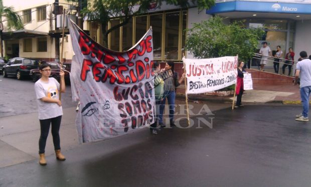 “Por Lucía”, así se denominó la movilización realizada frente a la Facultad de Humanidades y Ciencias Sociales, en pedido de Justicia a cuatro años del femicidio de Lucía Maidana (24), la estudiante universitaria violada y asesinada en abril de 2013. Hoy a cuatro años de su muerte, amigos, estudiantes y profesores se autoconvocaron frente a la Casa de Altos Estudios, ubicada calle San Lorenzo casi avenida Mitre.Desde allí, levantaron pancartas y panfletos y bajo la lluvia marcharon con el sonido de una sirena en dirección al microcentro de la capital provincial.“Lucía Maidana: presente, ahora y siempre”, se escuchó entre los marchantes. “Pedimos que los responsables sean detenidos. Pedimos justicia por Lucía”. Luego ingresaron por calle Bolívar y se detuvieron en la Plaza 9 de Julio, frente a la Casa de Gobierno. “No vamos a permitir que este femicidio quede impune. Nosotros exigimos Justicia”, fue uno de los tantos pedidos que se difundió desde un micrófono abierto. Desde ese lugar partieron camino al Juzgado que investiga la causa, ubicado sobre calle Santa Fe. En el lugar leyeron la carta de Felicitas Maidana, hermana de Lucía, donde explicaba los motivos de su ausencia. Finalmente, la manifestación concluyó cerca de las 11.“Solo esperamos respuestas, son cuatro años de pedir justicia”, dijo a PRIMERA EDICIÓN Estefi Dávalos, estudiante de la Facultad de Humanidades y Ciencias Sociales.Fotos y videos S. Breska