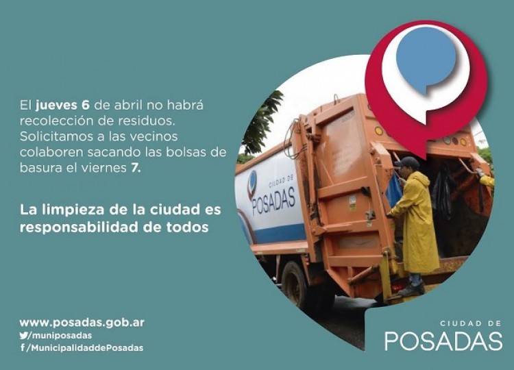 Con motivo del paro nacional convocado para este jueves, la Municipalidad de Posadas anunció que sus trabajadores del área de Servicios Públicos se plegarán al cese de actividades.Esto significa que entre las últimas horas de este miércoles y las primeras del jueves no se realizará la habitual recolección de residuos.Por esta razón, desde la Comuna solicitan a los vecinos que no saquen su basura y lo hagan recién el viernes.